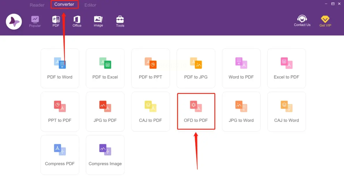1. 选择转换功能:打开软件后,在顶部标签页中找到“Converter”选项,然后在下方找到“OFD to PDF”功能按钮。这个按钮清晰明了,方便快速进入转换界面。