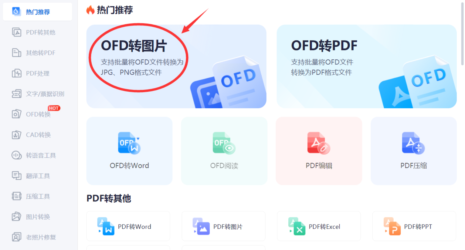 在主界面或功能菜单中,找到“文件转换”或“格式转换”相关分类,从中选择“OFD转图片”或类似选项。部分软件可能将OFD转换归类在PDF工具下,因为两者同属版式文档格式,功能上有相似之处。