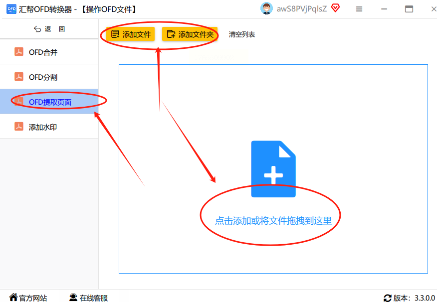 看面板的左侧,有一排功能列表。点击其中的“OFD提取页面”选项。这时候,右边的界面就变成了专门用来提取页面的样子。接下来,把你想要处理的OFD文件放进来。有两个办法:要么点击那个醒目的“添加文件”按钮,从电脑里找到它;要么更简单,直接用鼠标把文件拖到中间那个上传区域里。对了,这个软件支持一次性添加多个文件,排队处理,挺省事的。