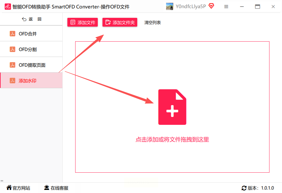 1. 上传OFD文件:点击界面右侧的“添加文件”按钮,选择需要加水印的OFD文件。支持批量上传,一次可处理多个文件,非常适合需要大量加水印的场景。