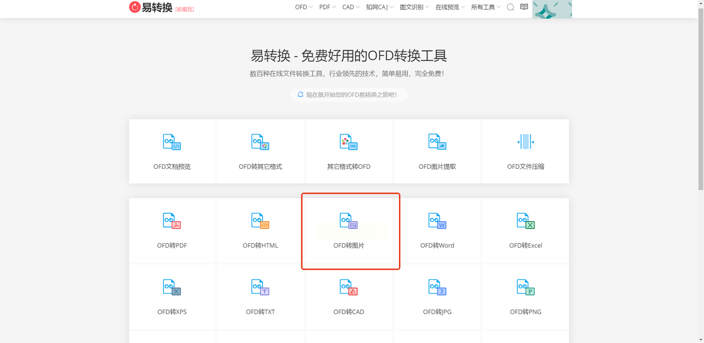 步骤一:进入官网后,在功能区找到「所有工具」中的「OFD工具」,选择「OFD转图片」功能。