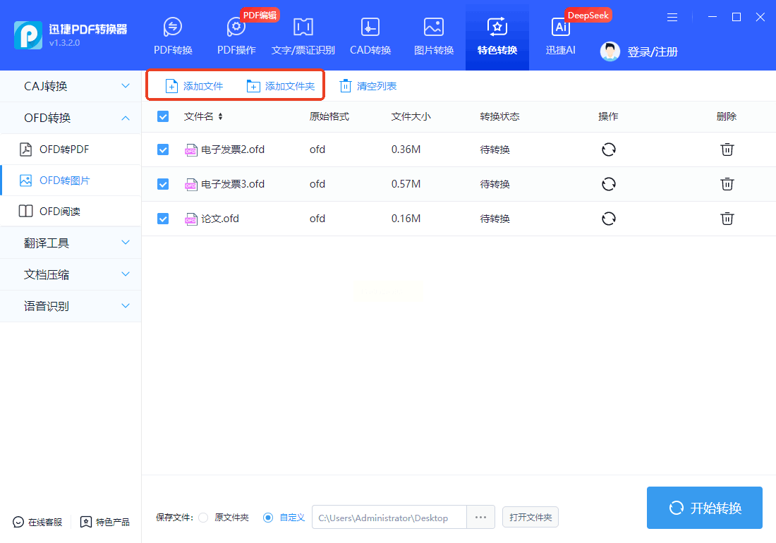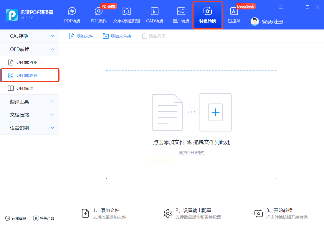 1. 打开软件:启动迅捷PDF转换器,在首页找到"特色转换"板块,点击进入"OFD转换"功能。
