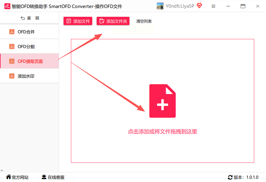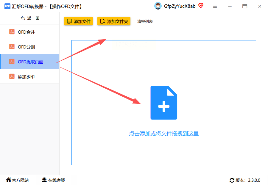 在功能区左侧列表中,选择"OFD提取页面"选项。此时界面右侧会出现文件上传区域,支持直接拖拽OFD文件到指定区域,或点击"添加文件"按钮进行本地文件选择。该工具支持同时上传多个文件,适合批量处理需求,上传进度会实时显示。