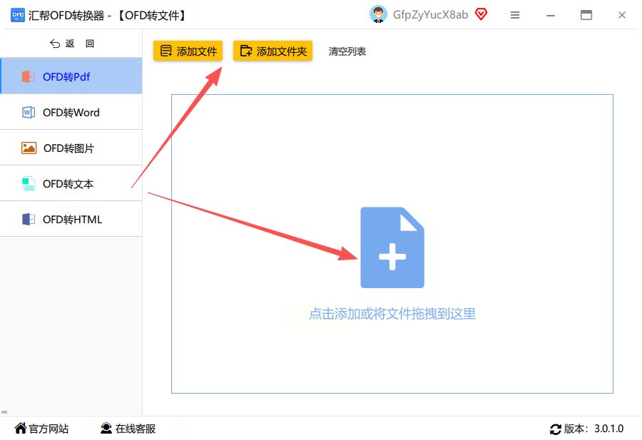 步骤二:进入转换界面后,你需要添加想要转换的OFD文件。点击“添加文件”按钮,从你的电脑里选择单个OFD文件。如果你有很多文件要处理,也可以直接点击“添加文件夹”,或者更简单粗暴地把文件直接拖拽到软件窗口里,它支持批量操作,非常省事。