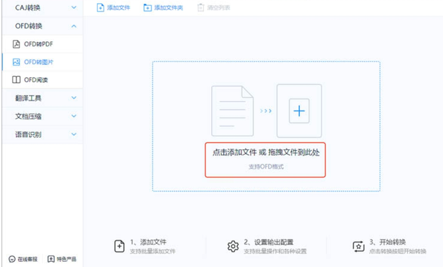 3. 添加OFD文件:点“添加文件”按钮,从电脑里找到要转换的OFD文件,也可以直接把文件拖到软件空白处,支持同时选多个文件批量处理。