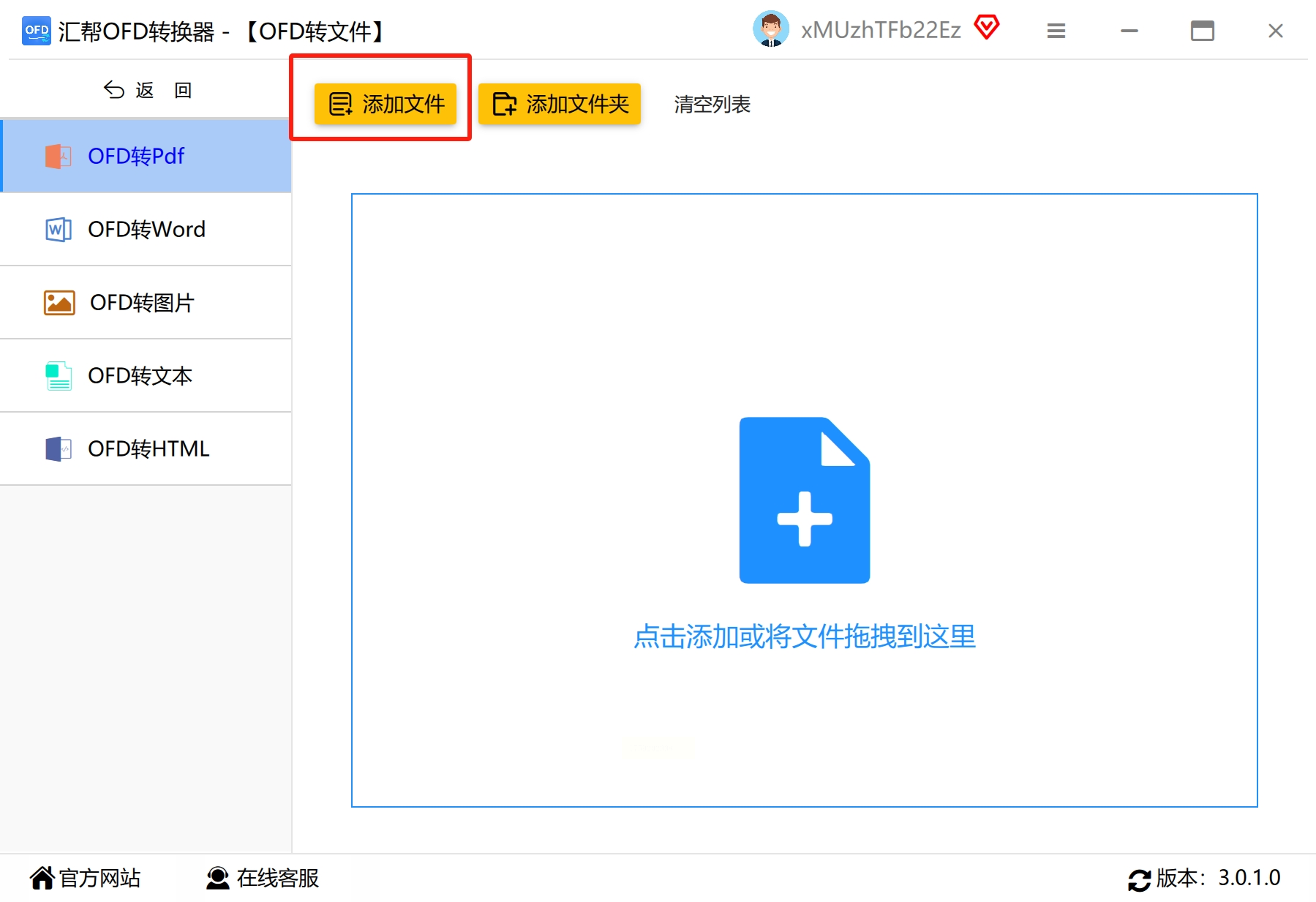 步骤二:点击中央工作区的"添加文件"按钮,支持批量导入多达50个OFD文档