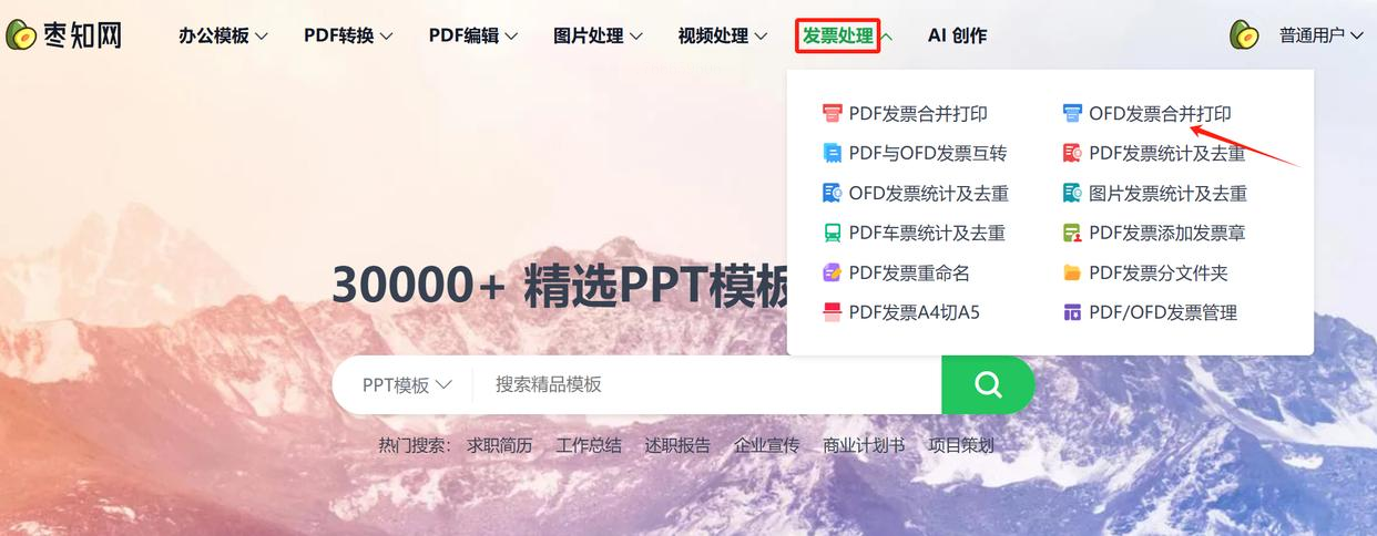 同样,通过搜索找到“枣知网”官网。在它的服务菜单里,寻找“发票处理”或类似栏目,进去后点击“OFD发票合并打印”。