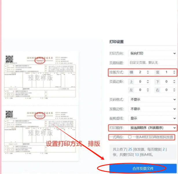 文件传好后,稍微看一下下面的选项。比如打印方式(是每张A4纸打1张发票还是2张),排版要不要加边框。如果没啥特殊要求,用默认的就行,通常默认设置已经很智能了。最后,果断点击那个“合并发票文件”的大按钮。