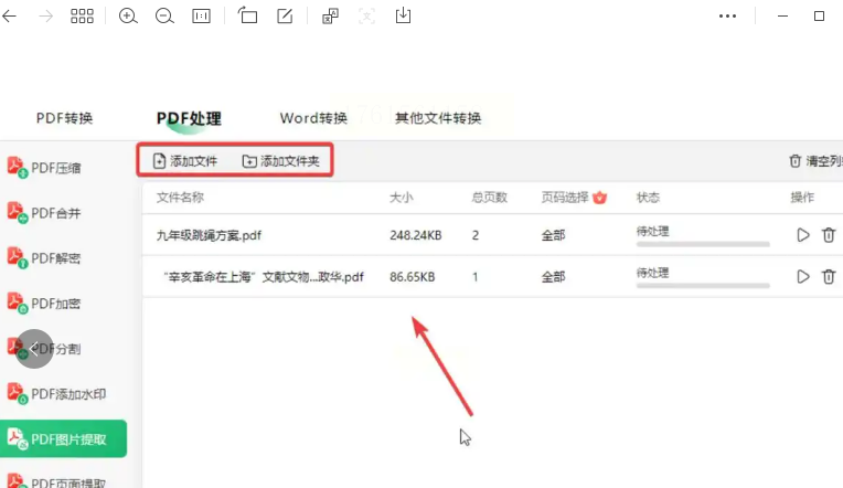 2. 在这个界面,你可以一次性添加多个PDF文件,甚至是整个文件夹。点击“添加文件”或者“添加文件夹”,把你需要处理的所有PDF都选上,软件会把这些文件列成一个清单。
