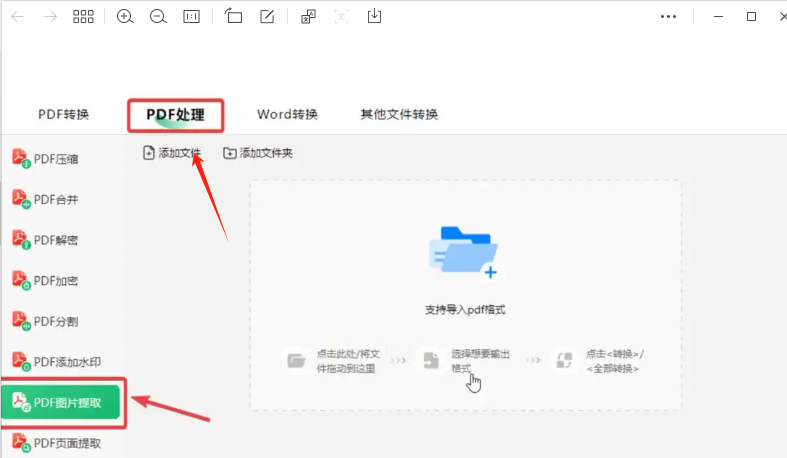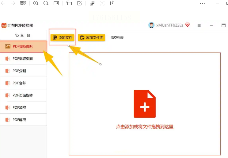 2. 接下来,把你想要提取图片的PDF文件导入到这个软件里。操作很简单,你可以直接把电脑里的PDF文件用鼠标拖拽到软件界面的空白区域,也可以点击那个明显的“添加文件”或者“点击选择文件”的按钮,从文件夹里浏览选择。
