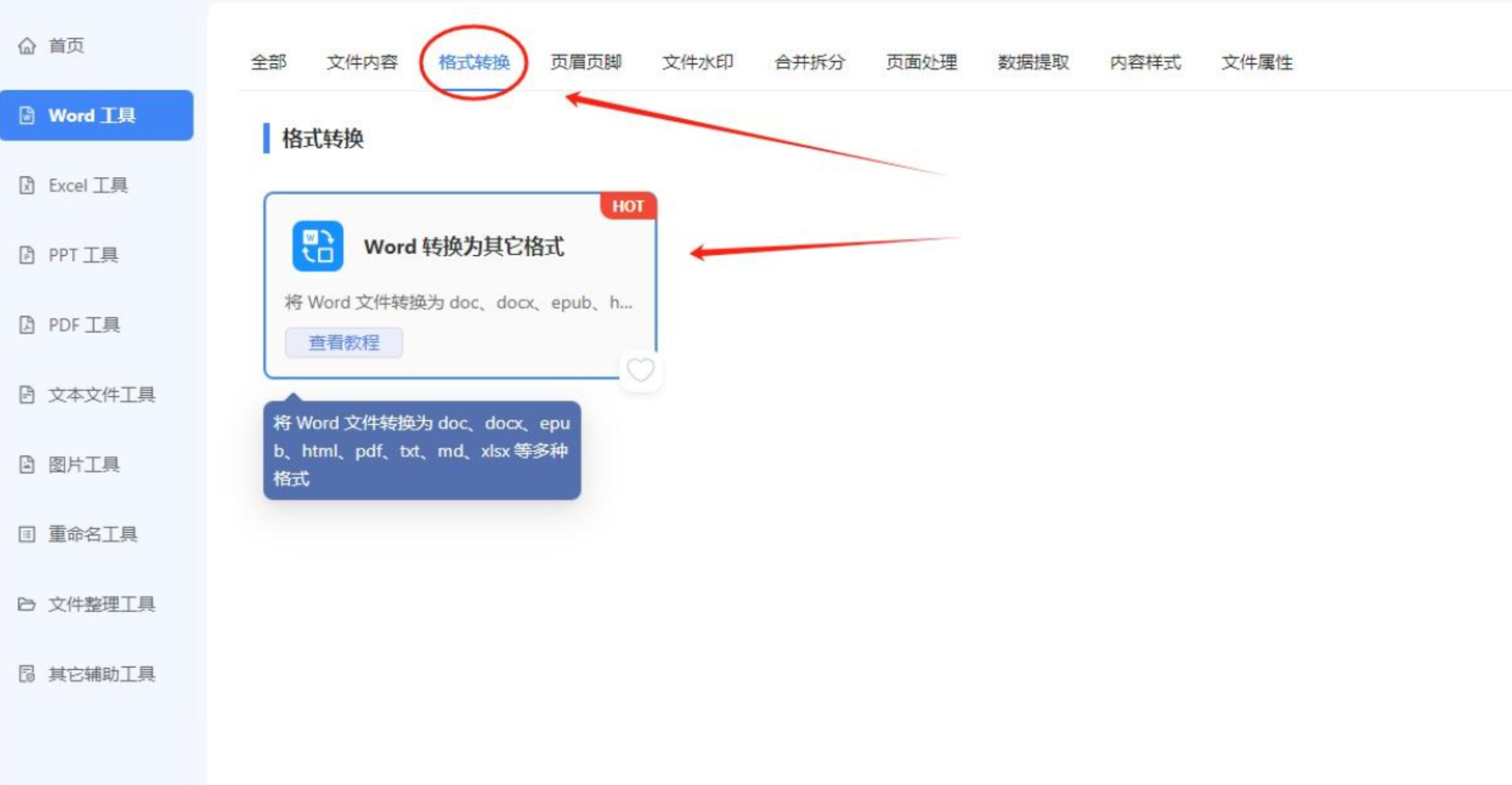 步骤一:在软件左侧选择“Word工具”,然后点击“Word转换为其它格式”。