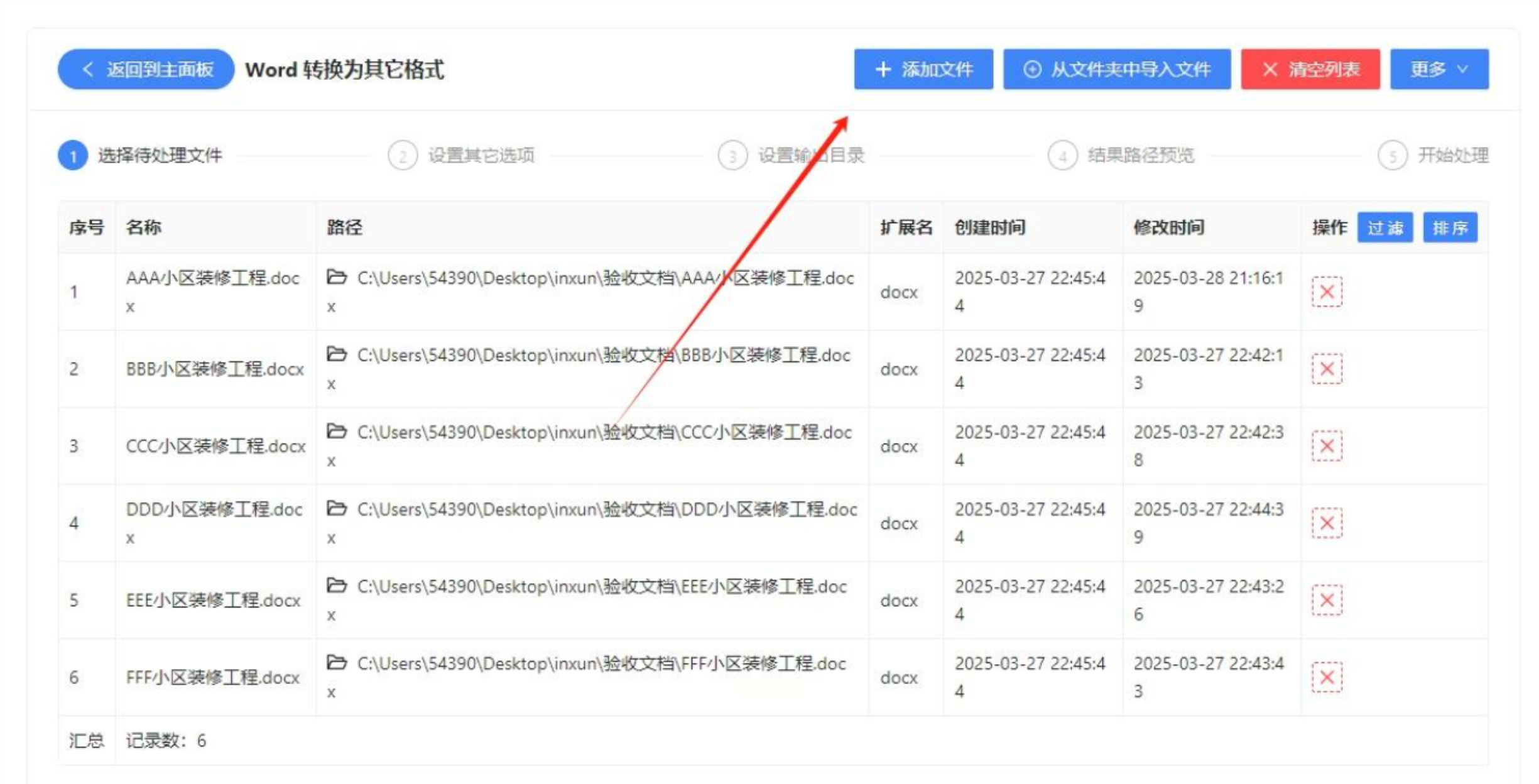 步骤二:通过“添加文件”或拖拽方式导入一个或多个Word文档。