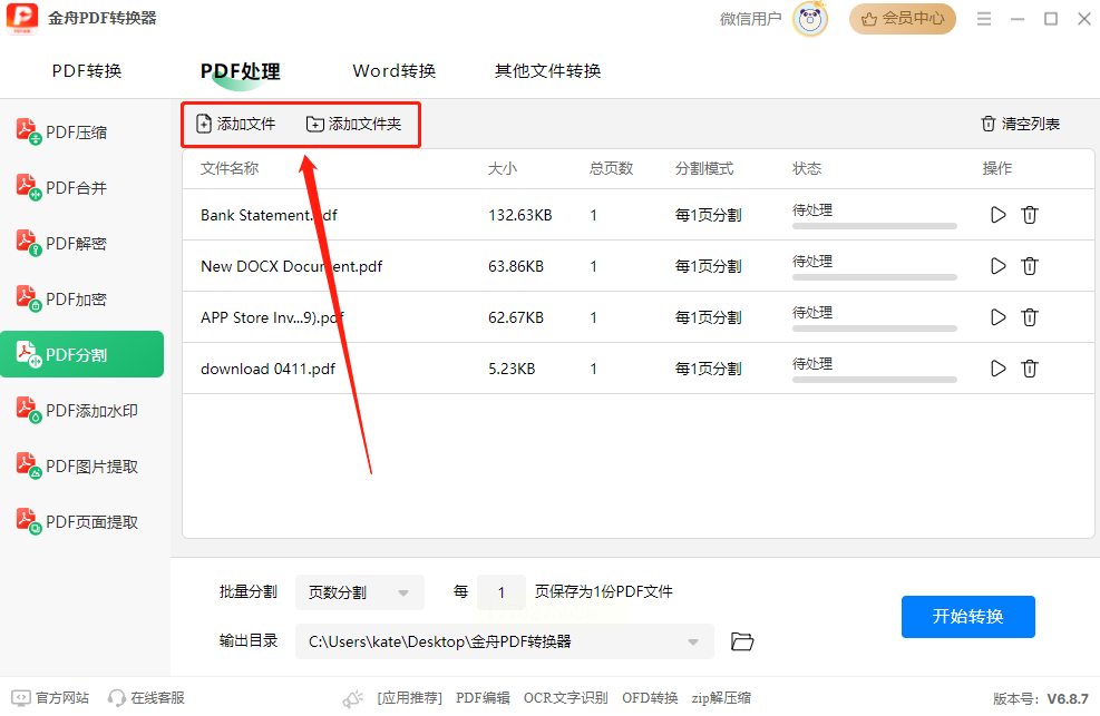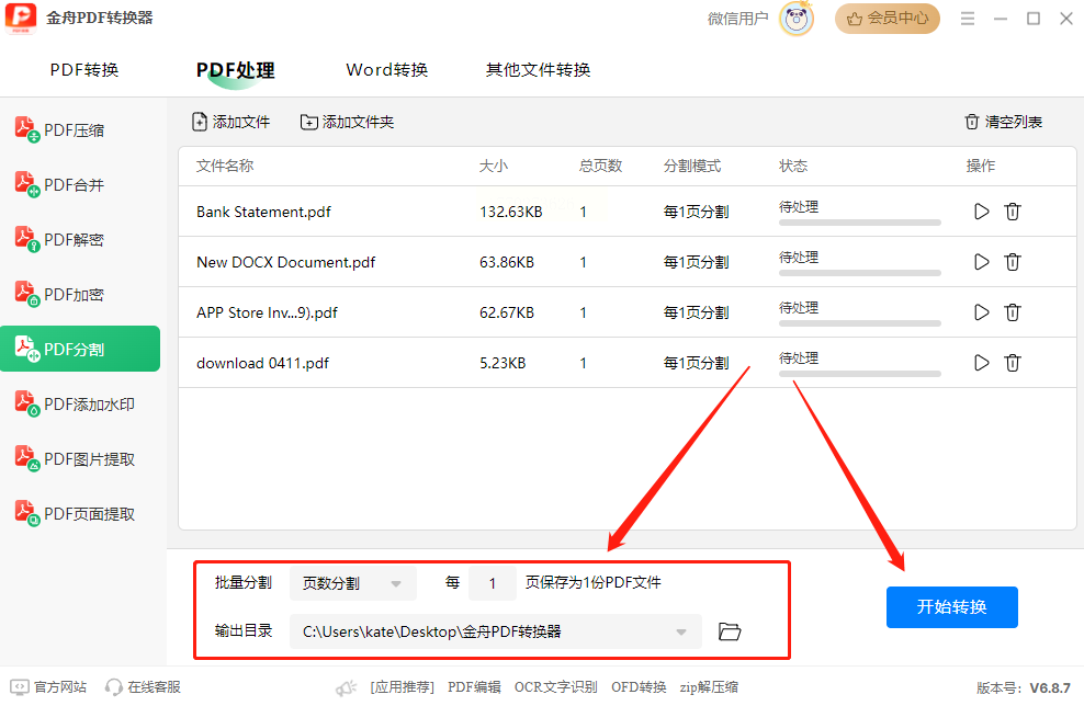 3. 在下方设置分割规则(如按页数、范围),并指定输出目录;