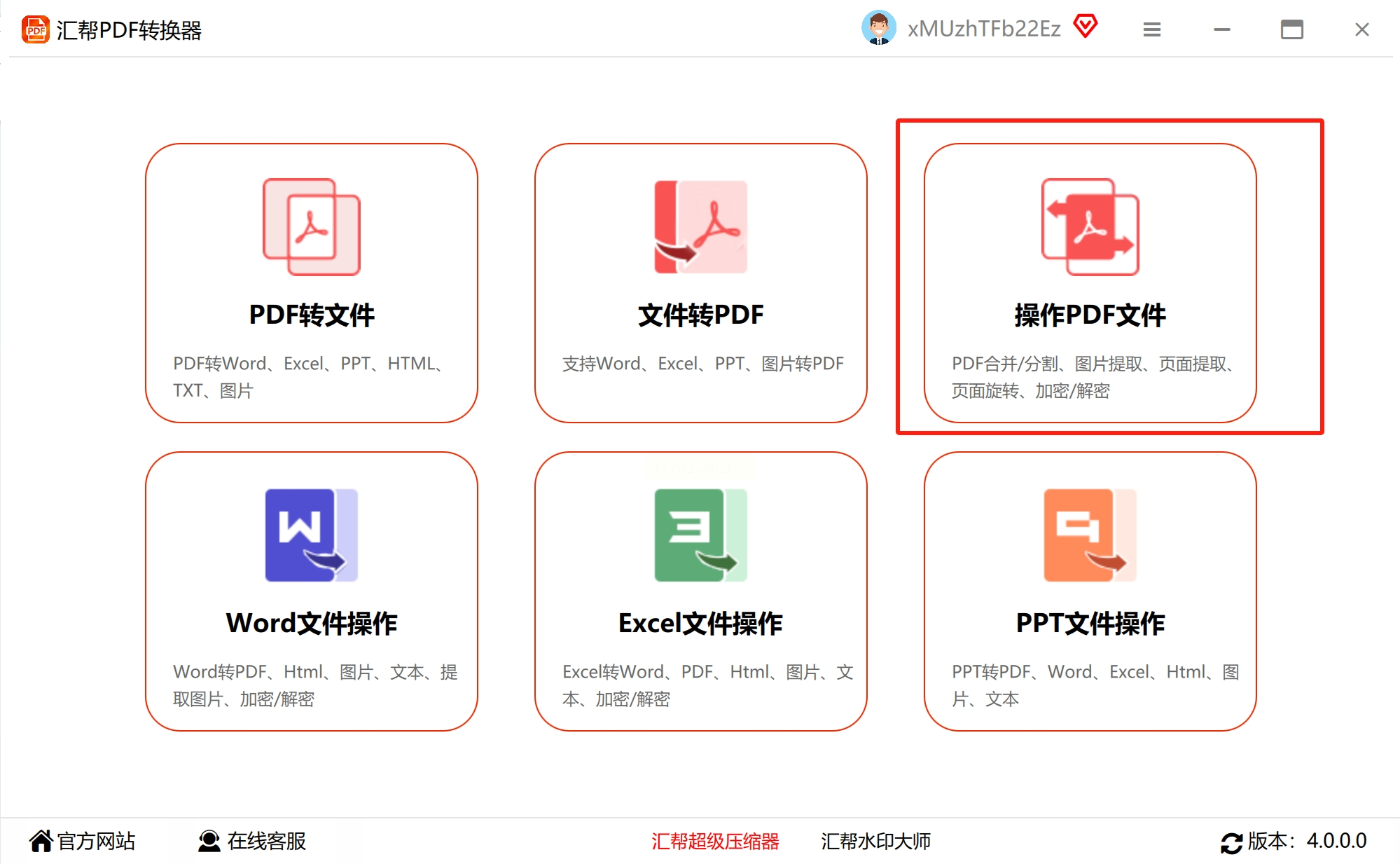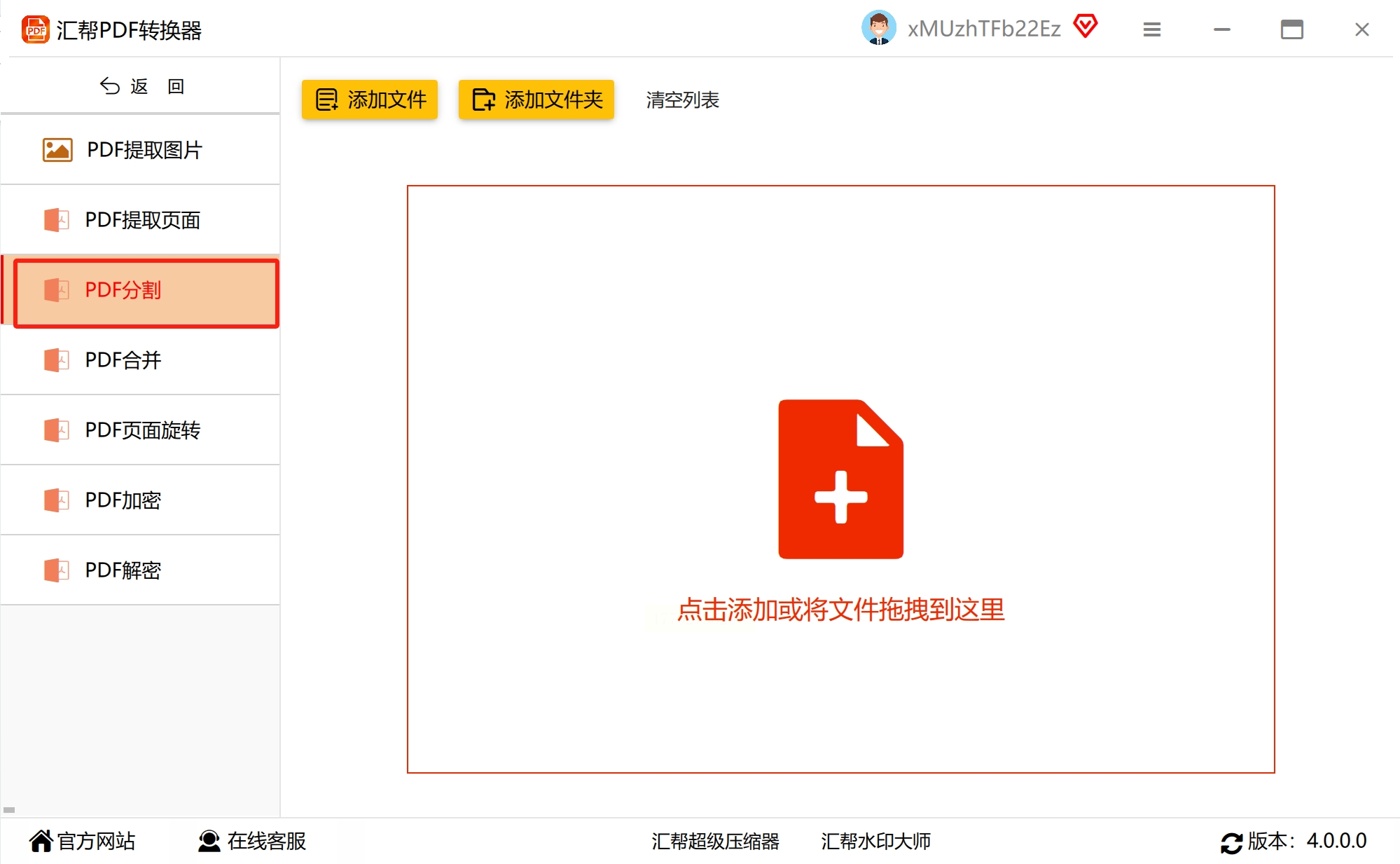 打开汇帮PDF转换器后,在主界面点击"PDF处理"模块(或对应"文件操作"入口),界面将展示合并、分割、转换等功能选项。此时需明确选择"PDF分割"功能,确保进入正确处理模块。