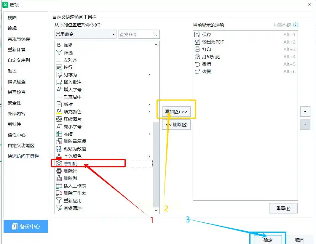 在左侧的命令列表中,找到“不在功能区的命令”这个分类。滑动查找直到发现“照相机”图标,它的标志是一个相机图案。选中后点击“添加”按钮,将其放入快速访问工具栏。这样工具栏上就会出现相机图标,以后使用就方便多了。