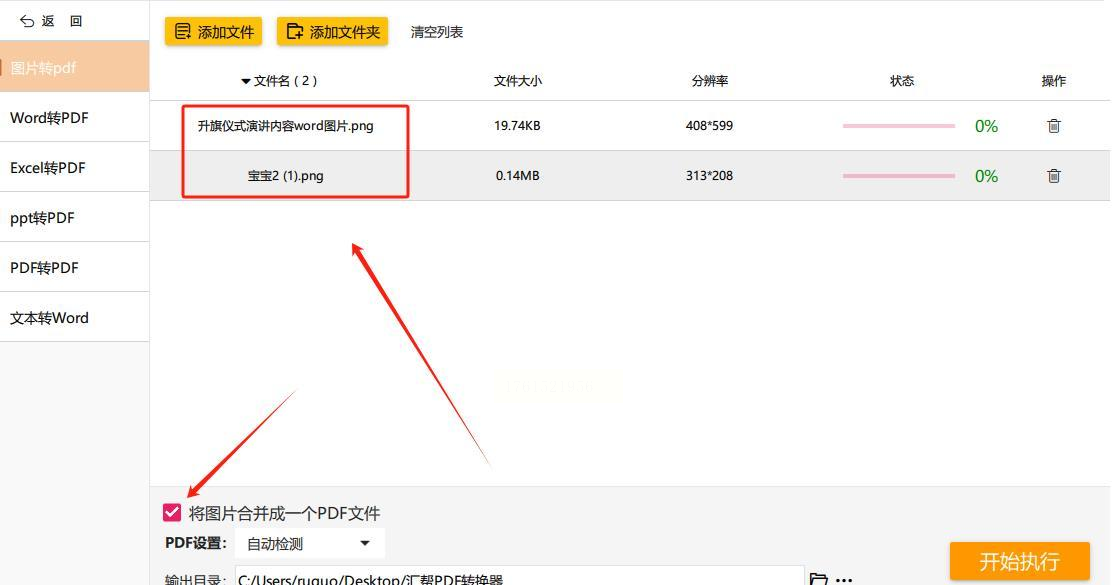 这个步骤很关键,不勾选则会生成多个独立PDF。最后,点击右下角的“开始转换”按钮,系统会自动执行合并操作。