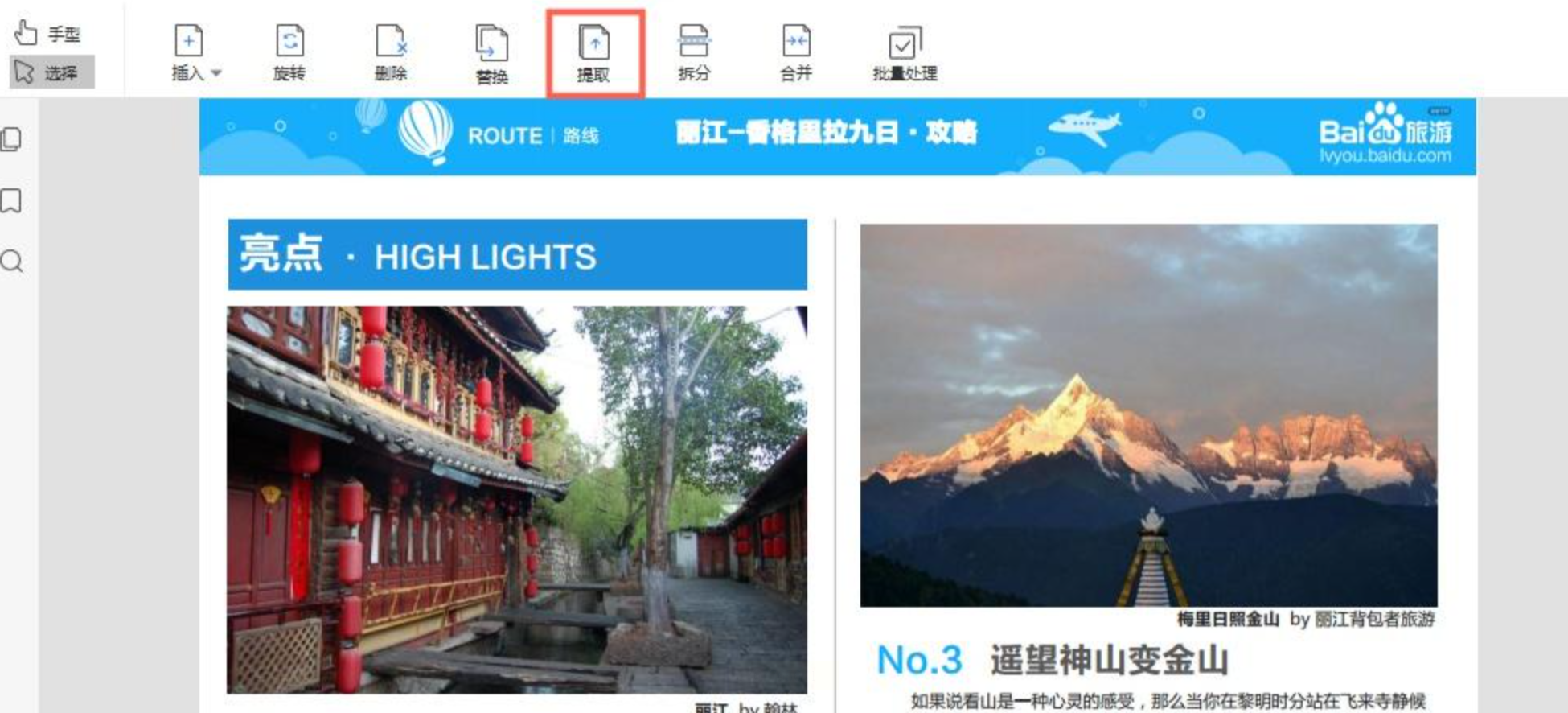 步骤三:文件上传并解析后,页面会显示文档缩略图。找到工具栏上的【页面】或类似选项,点击其中的【提取】按钮。
