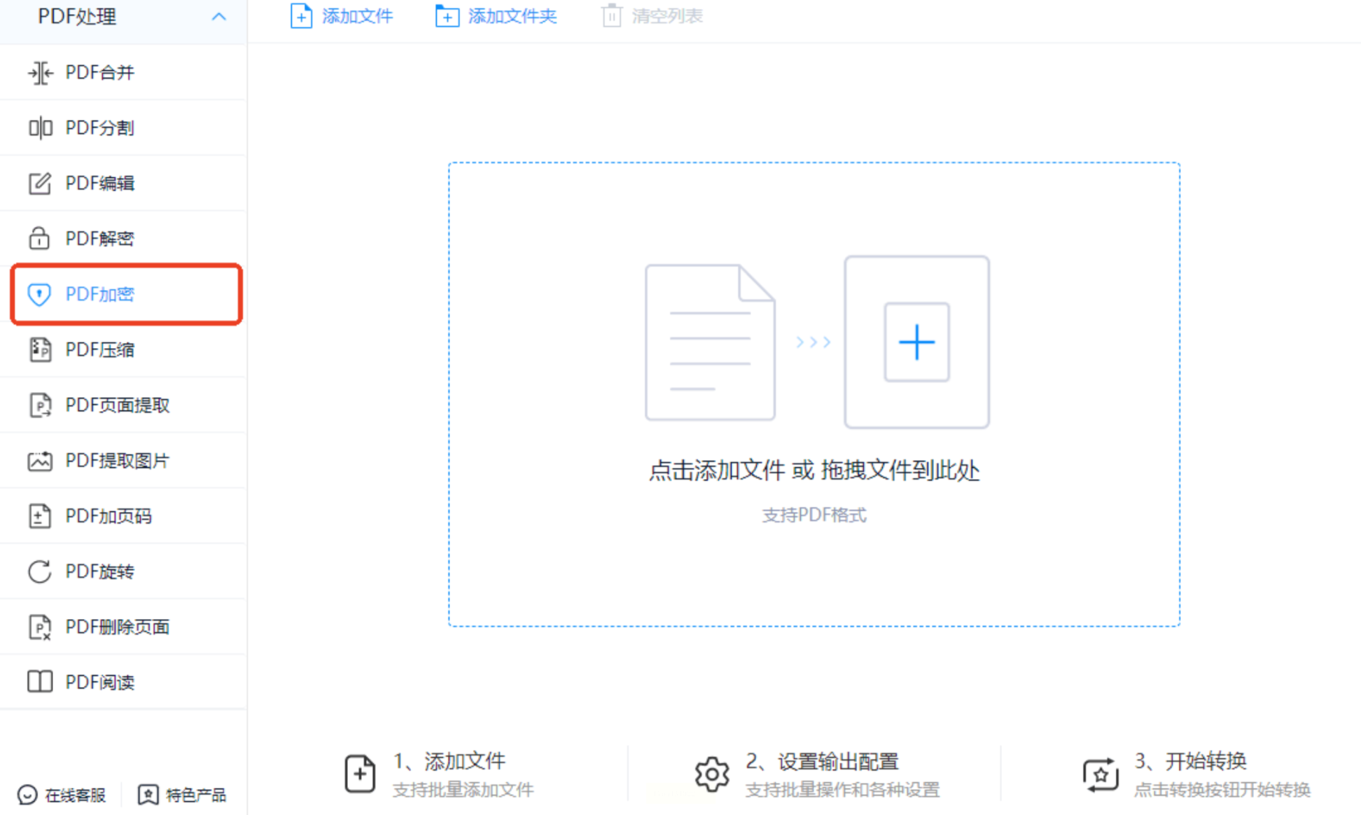 打开软件后,在主界面左侧菜单栏找到「PDF操作」,点击里面的「PDF加密」按钮。(如果没找到,直接在搜索框输入“加密”也行,软件会贴心地自动定位功能~)