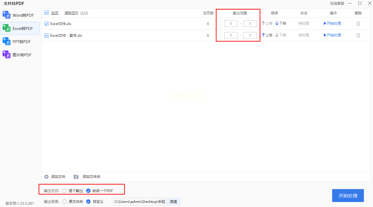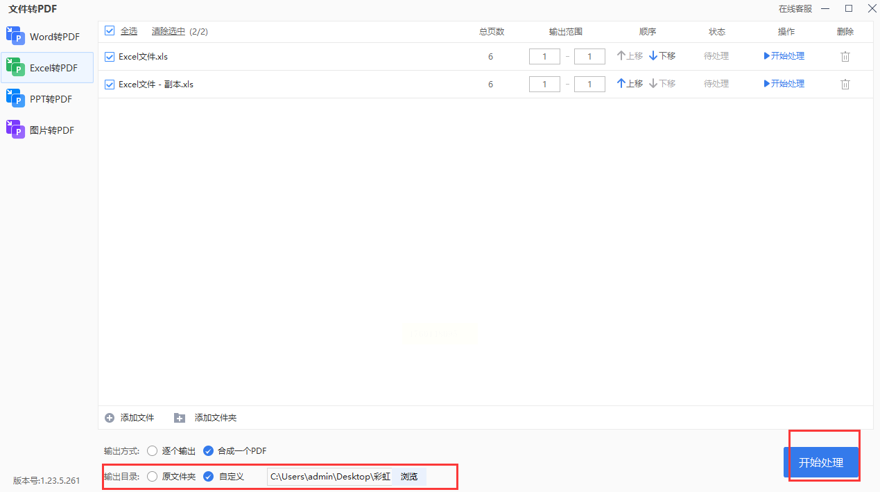 步骤四:开始处理。设置好输出目录后,点击“开始处理”按钮。软件会快速转换,完成后在指定文件夹查看PDF文件。