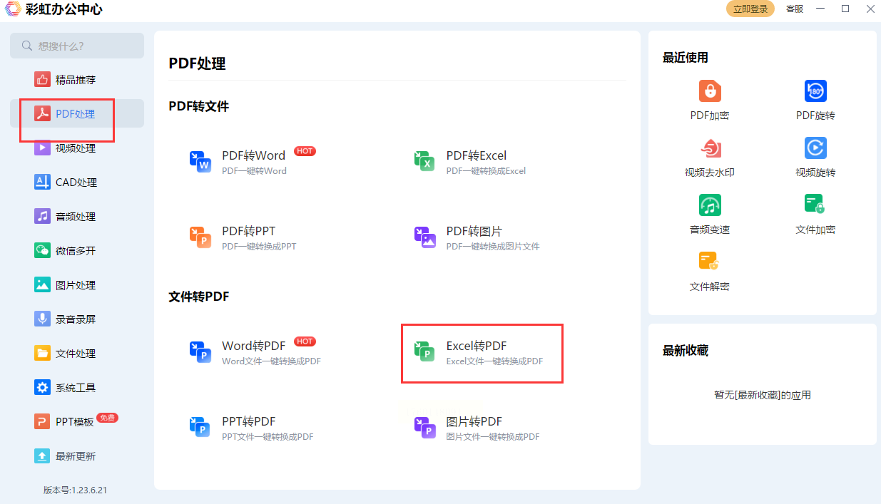 步骤一:打开彩虹办公中心软件,在主界面找到“PDF处理”分类,点击进入后选择“Excel转PDF”选项。
