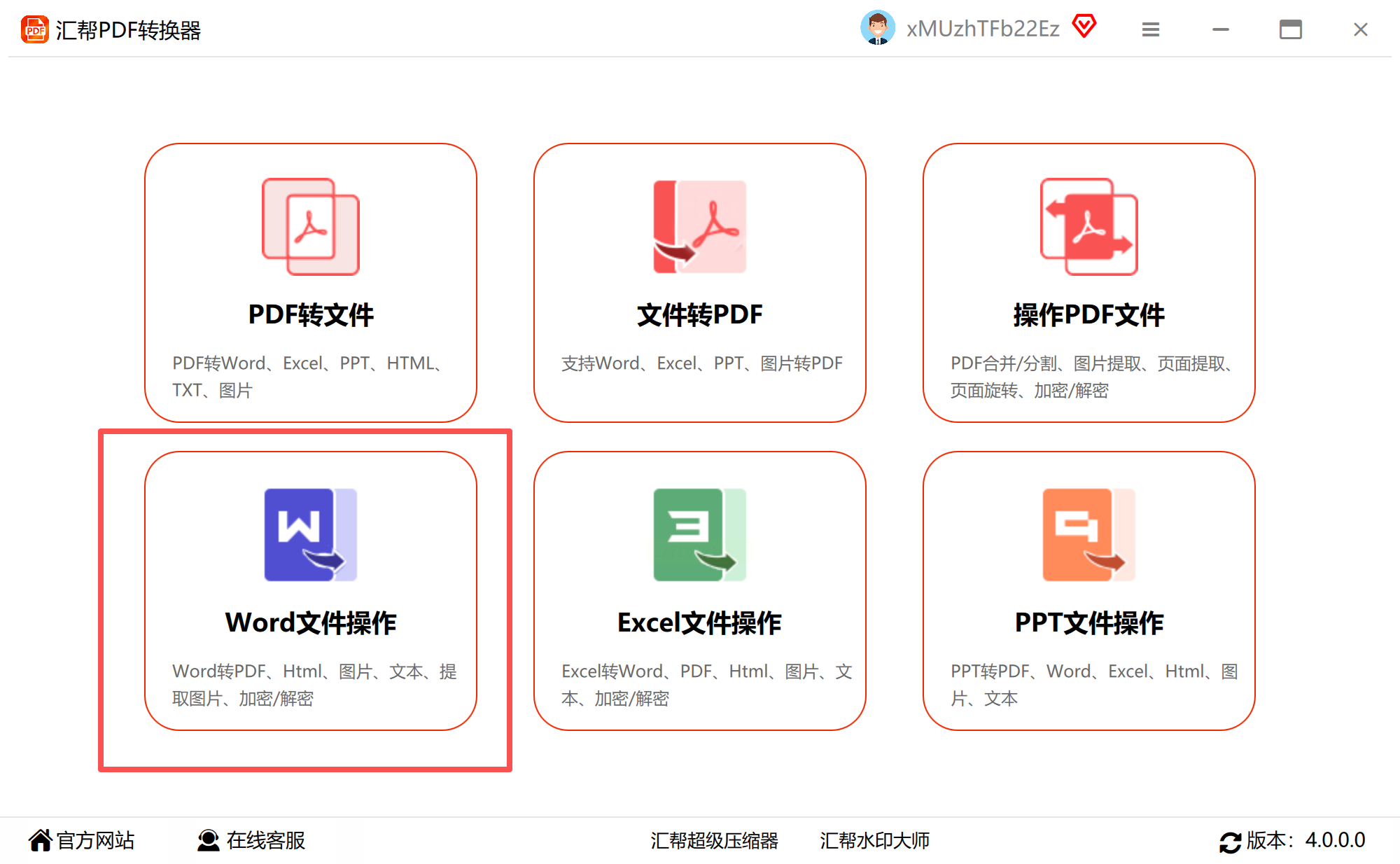 1. 打开汇帮PDF转换器(这里先忽略软件名,专注步骤),在功能区找到「Word文件操作」模块