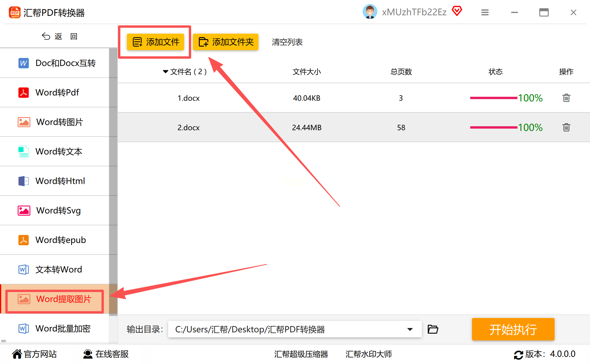 2. 左侧栏选择word提取图片,点击「添加文件」,一次最多可添加20个Word文档,支持批量处理