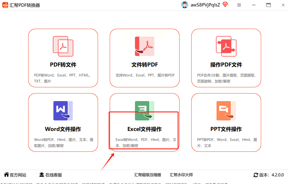 打开汇帮PDF转换器后,主界面上你会看到一排功能选项,找到“Excel文件操作”这一栏,点进去。这里面不止能转TXT,PDF、Word、图片转文本都能搞定,功能特别全,而且界面设计得很直观,一点都不复杂。