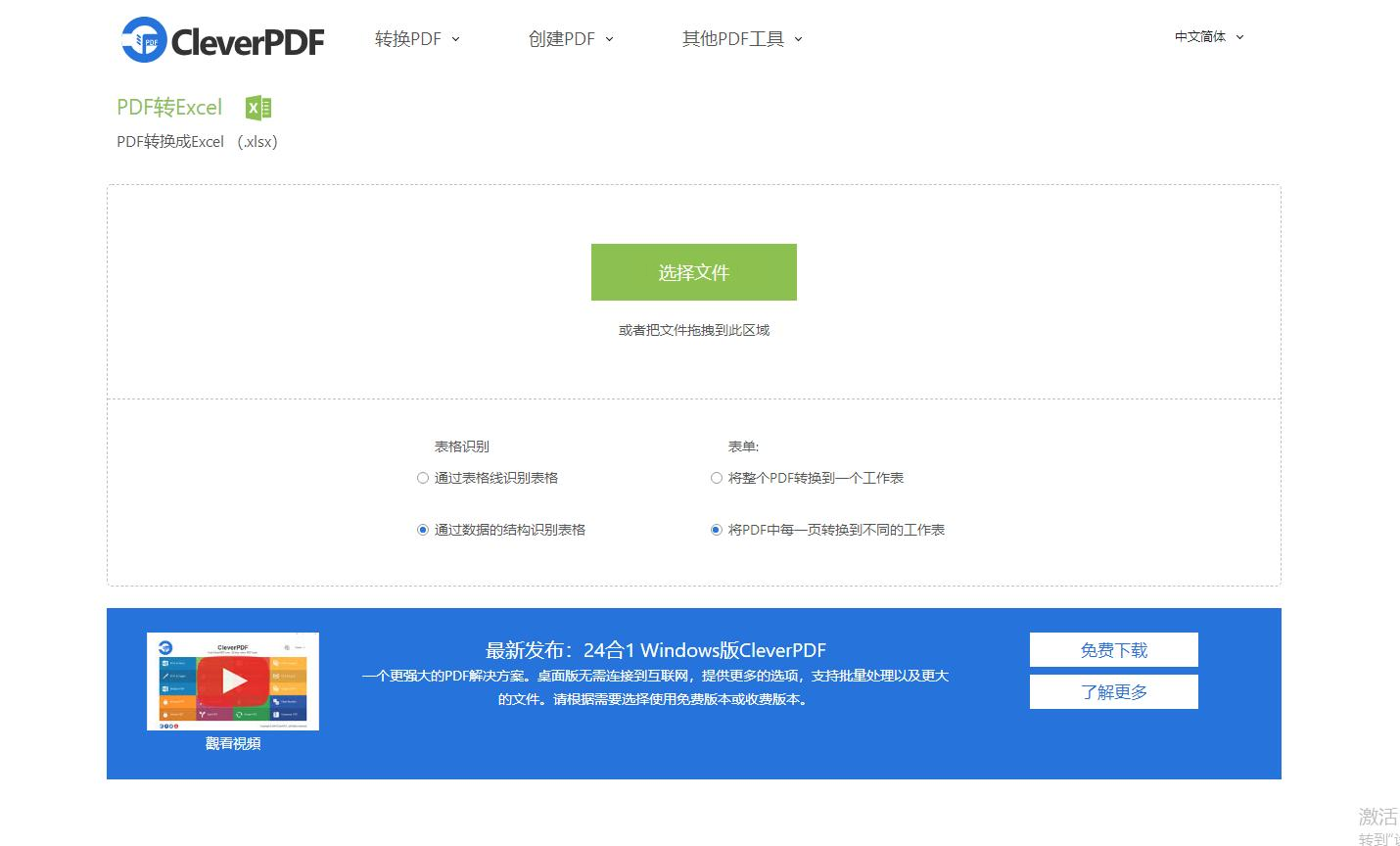 点击上传按钮,添加你的PDF文件。有些高级选项允许你进行表格识别模式和表单设置(如果需要),然后点击“开始转换”。