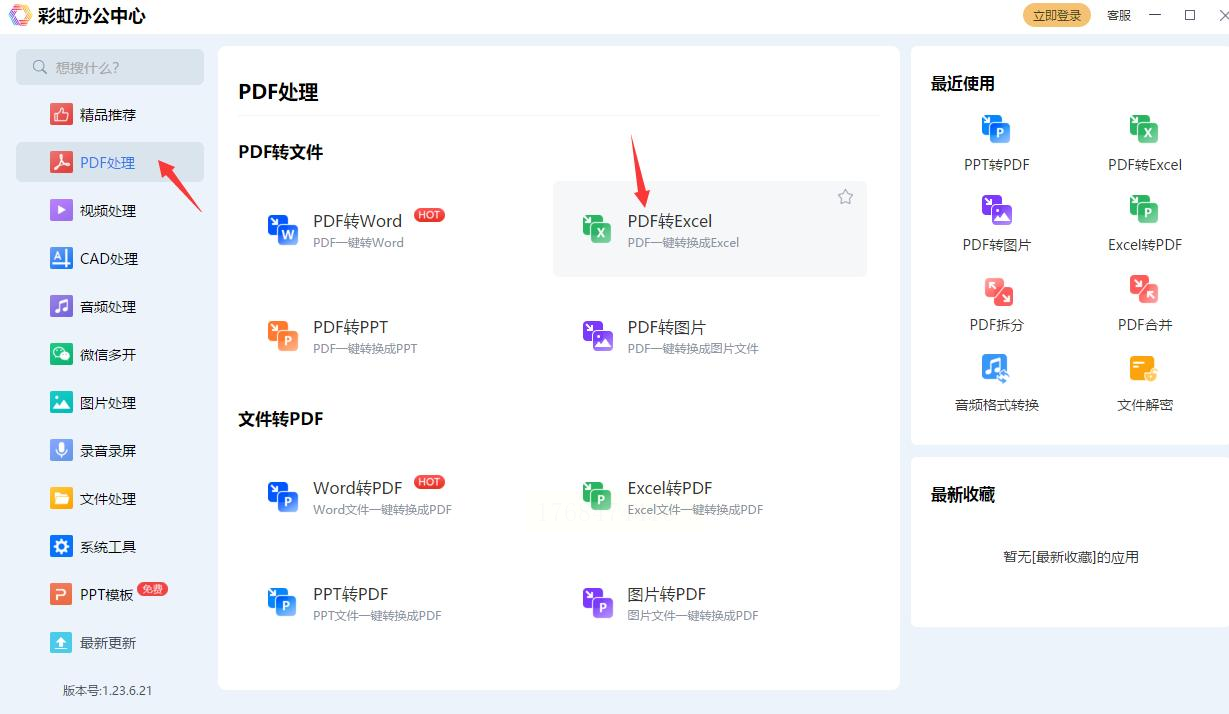 打开软件,在主界面找到“PDF处理”分类,然后点击其中的“PDF转Excel”功能。