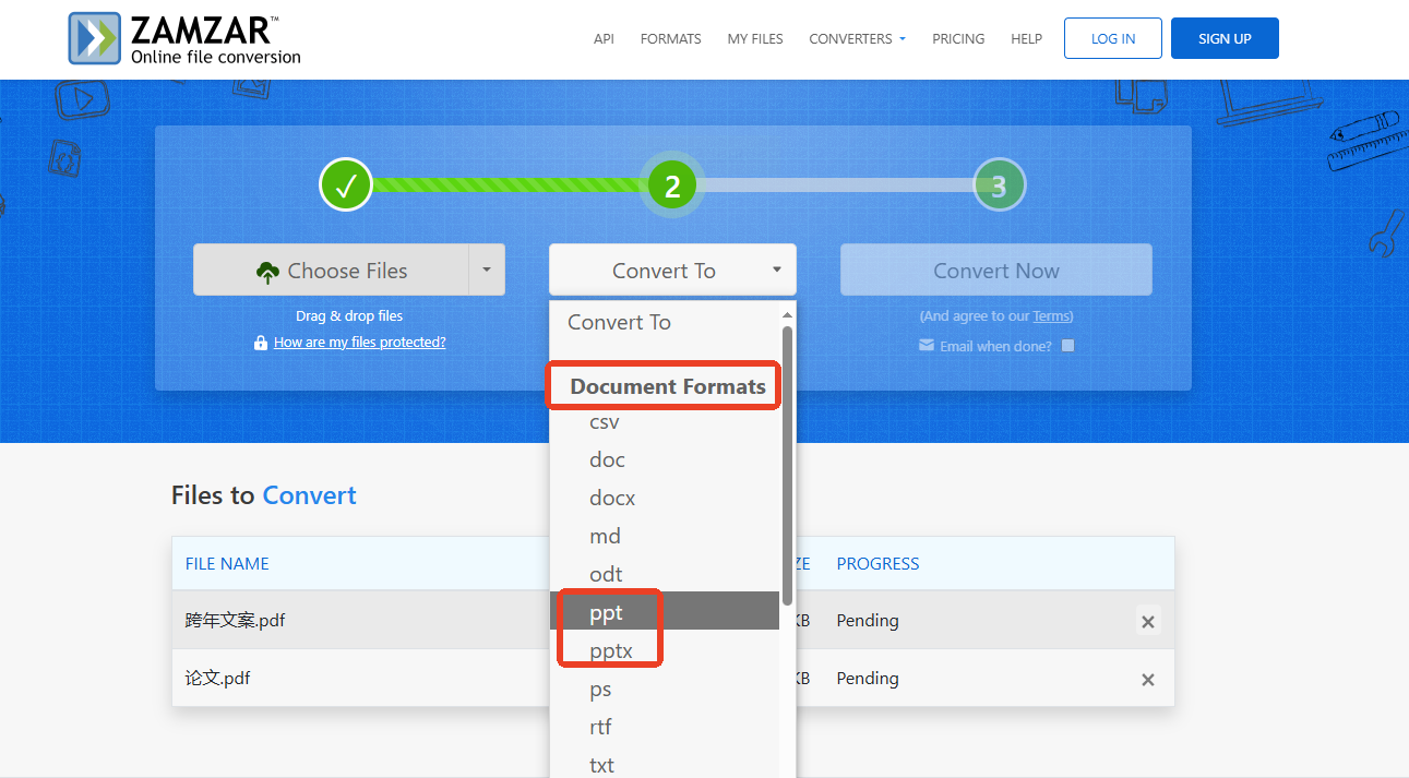 步骤一:进入Zamzar网站,点击“Choose Files”按钮上传您的PDF文档。