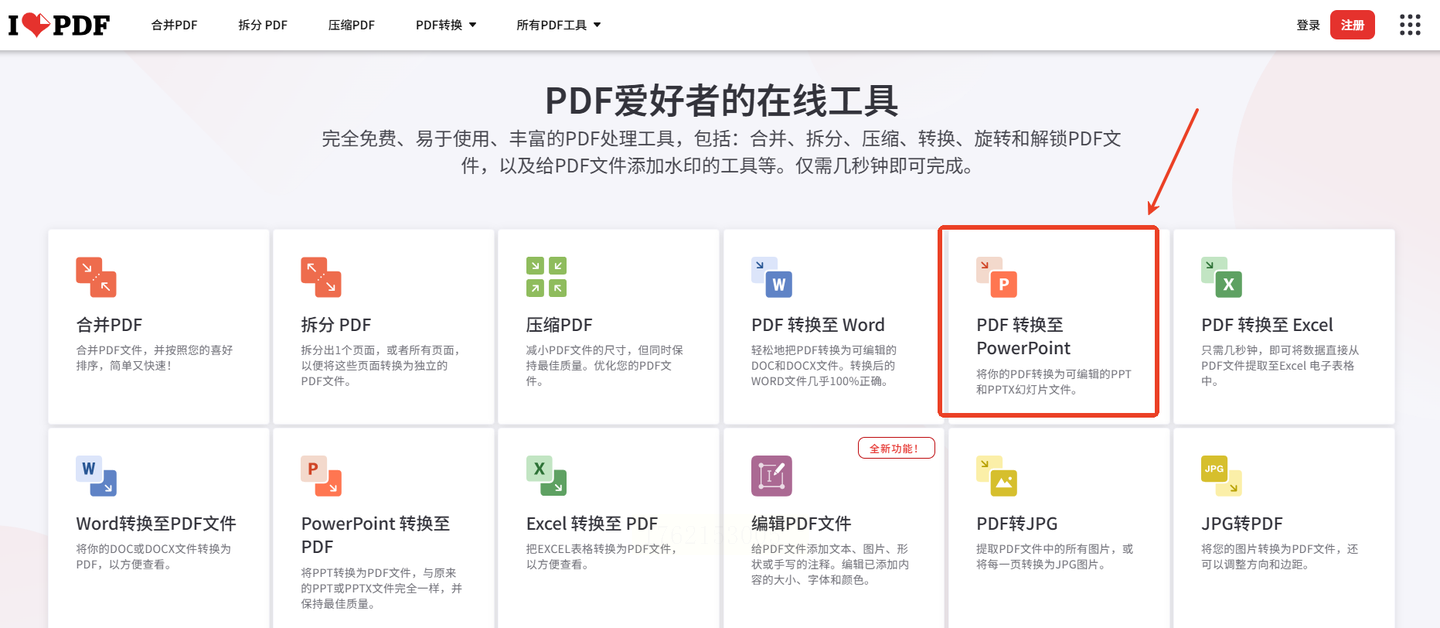 步骤一:访问ILovePDF网站,找到“PDF转换至PowerPoint”工具。