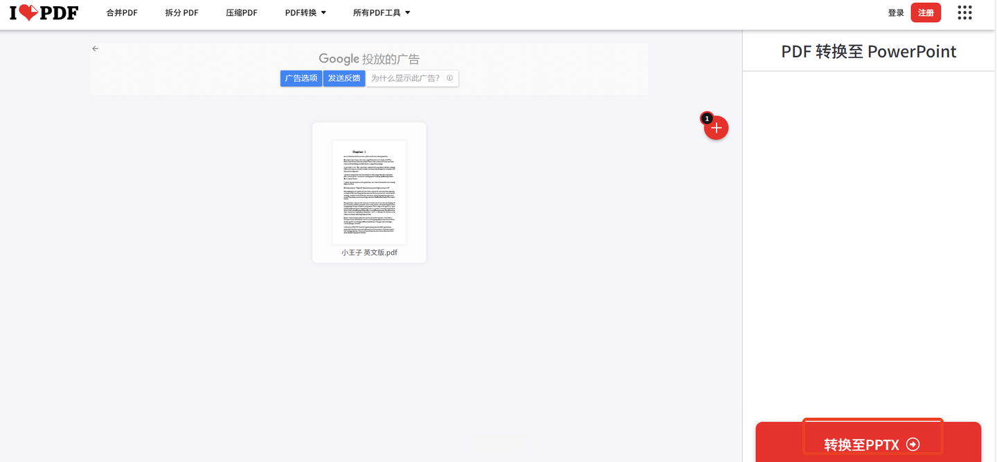 步骤二:点击上传按钮,将您的PDF文件添加到网站中。免费账户一次只能处理一个文件。