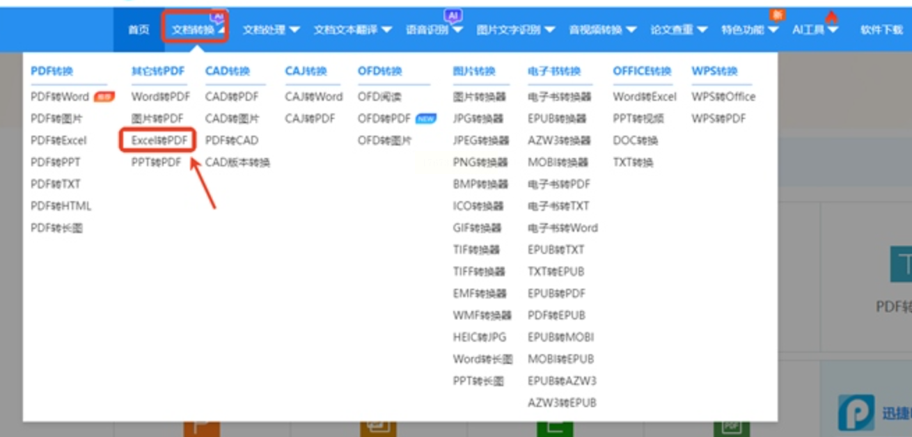 1. 打开浏览器,访问迅捷PDF转换器的官方网站。在首页或功能列表中,找到“文档转换”或类似分类,然后点击“Excel转PDF”功能。