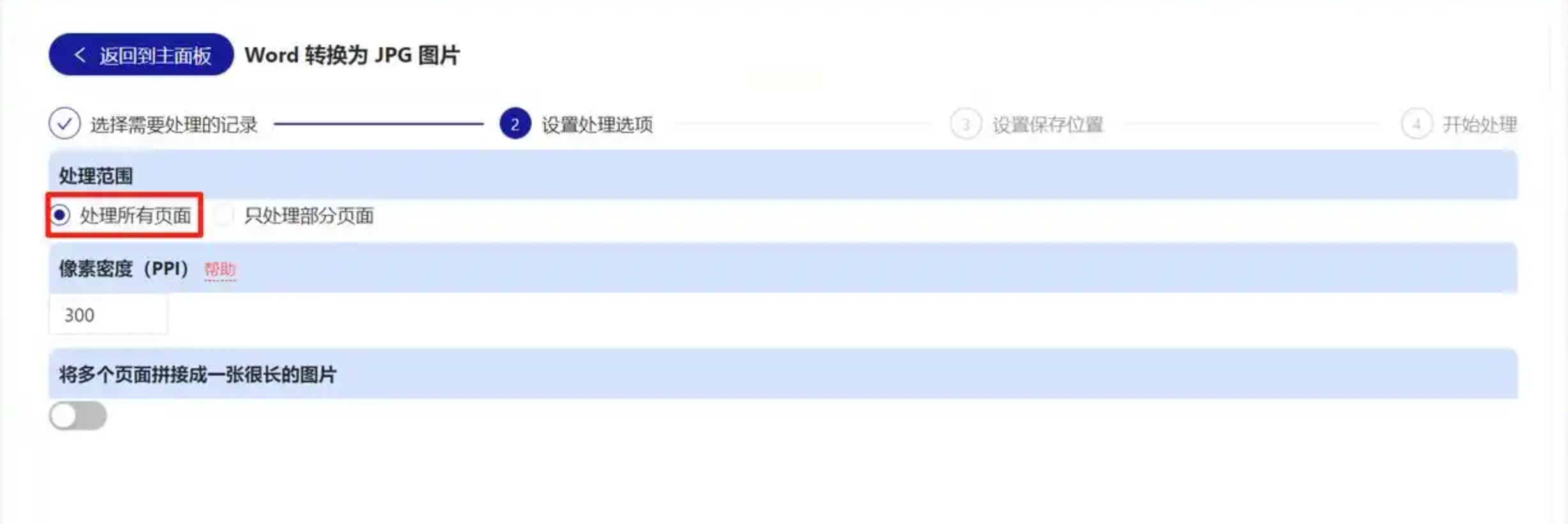 步骤三:在输出设置中,自定义图片格式、分辨率及页面范围。您可以选择转换全部页面,或指定从某页到某页;如需生成连贯的长图,勾选相应拼接选项即可。