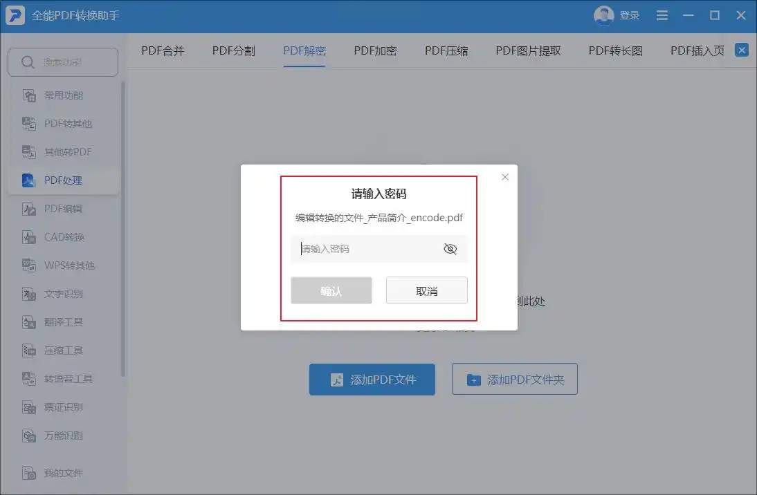 左侧功能栏中选择"PDF加密/解密"相关选项,右侧区域即可上传需要解密的PDF文件。支持批量上传,一次处理多个文件也很方便。