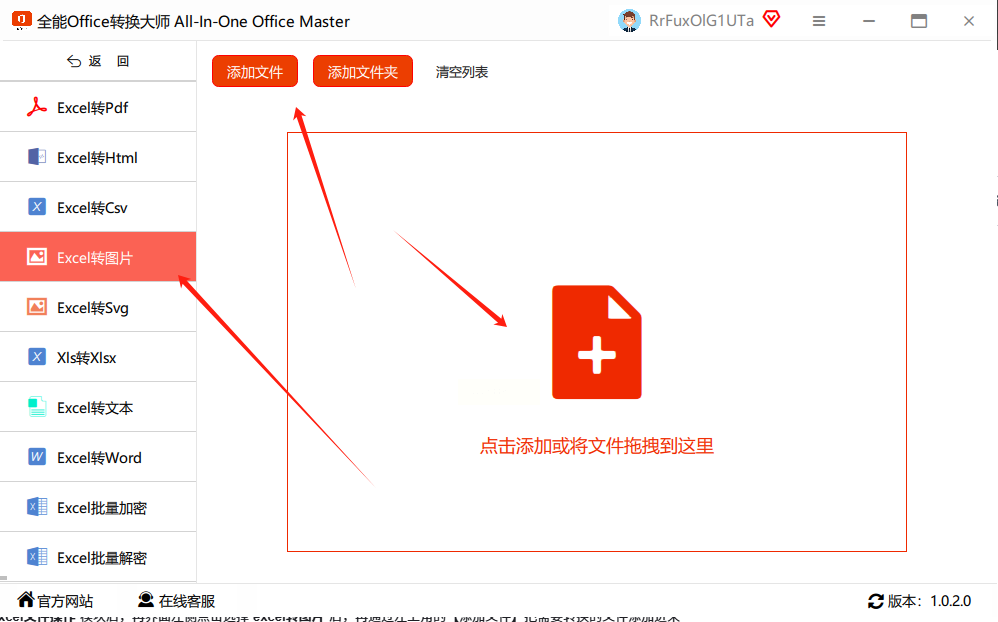 2. 选择转换功能:左边菜单里能看到「Excel转图片」,点一下,右边就会出现上传文件的地方。这里可以直接拖文件夹进去,或者点「添加文件」一个一个选,不管是1个还是100个文件都能批量处理,我之前试过传20个Excel文件,没遇到卡顿。