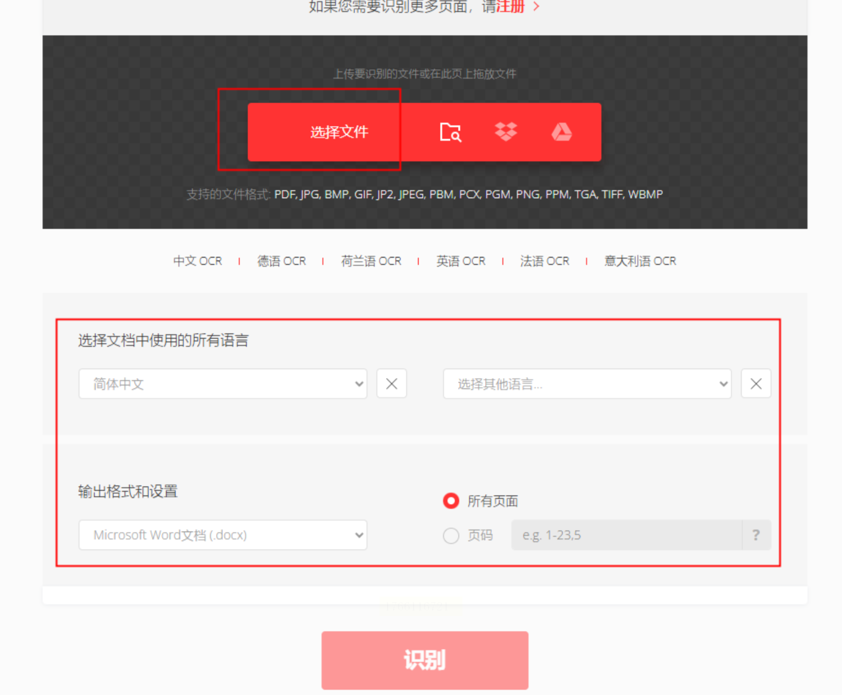 2. 上传文件:点击页面中央的“选择文件”,上传PDF文件。如果是扫描件,记得先勾选“OCR识别”。