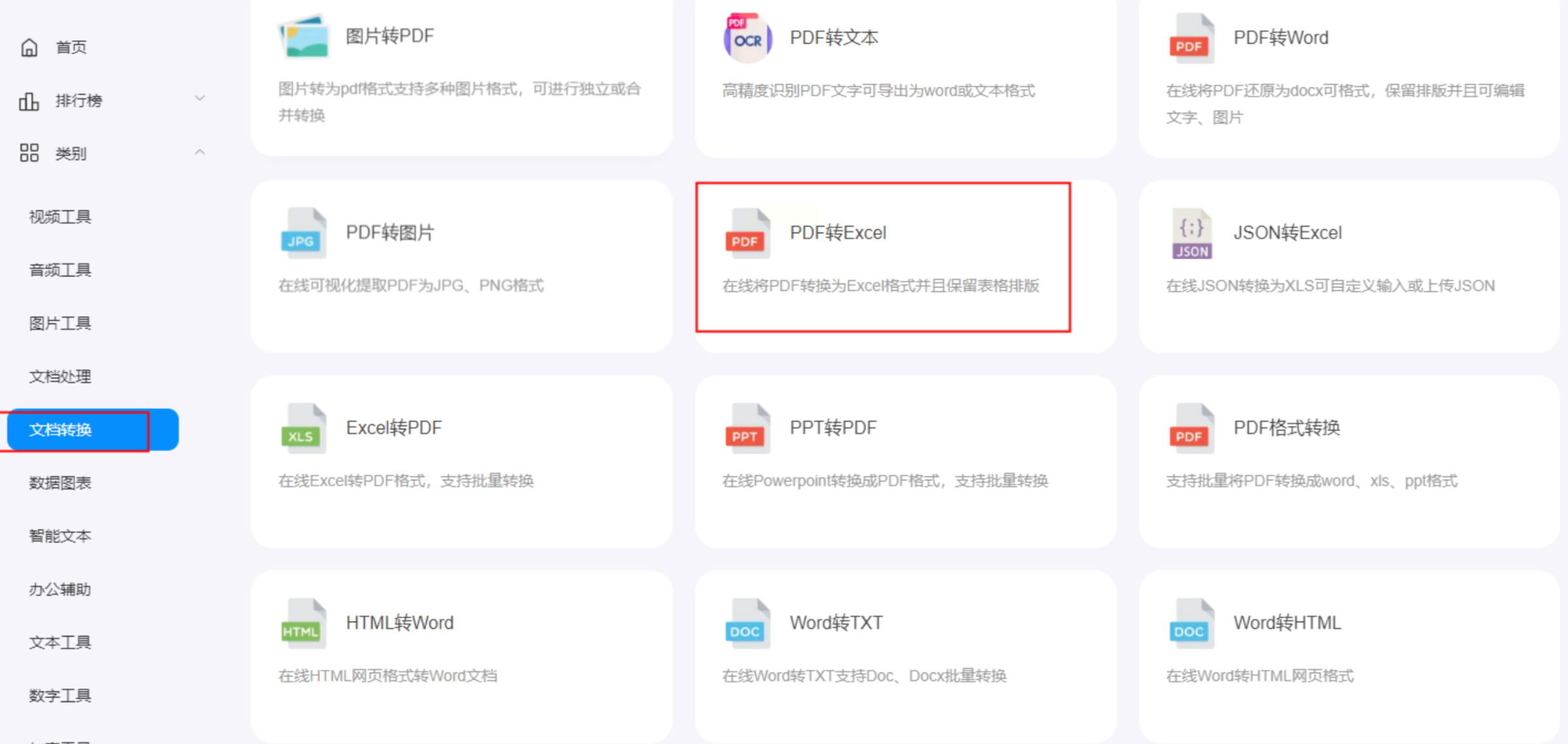 2. 进入转换模块:点击顶部菜单的【PDF转文件】,左侧列表找到【PDF转excel】。
