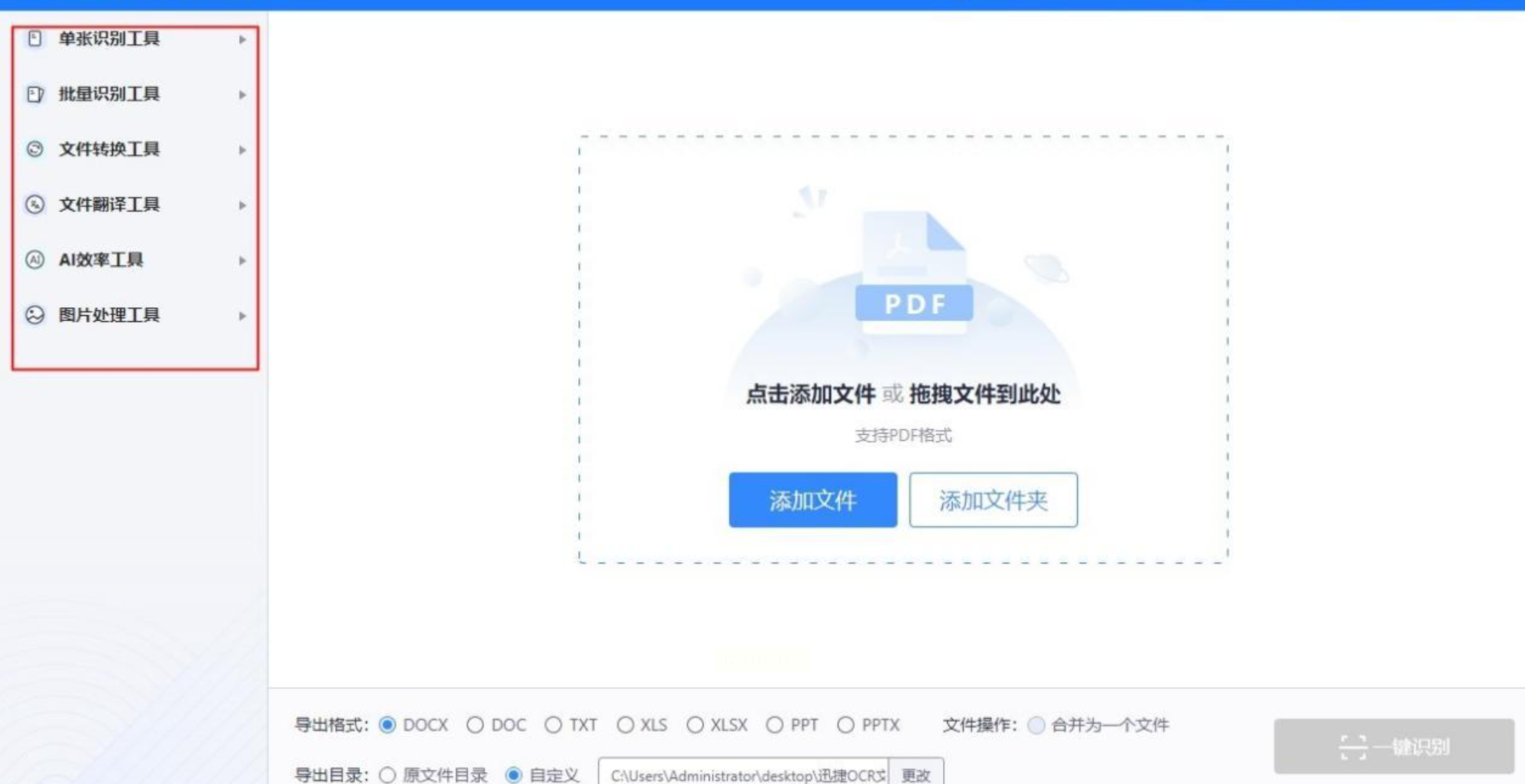 2. 选择识别模式:打开软件后,在左侧菜单找到“批量识别工具”,点击【PDF文档识别】。