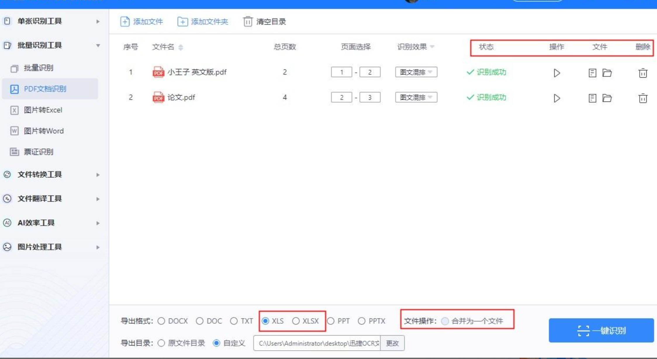 6. 开始识别:点击“开始识别”,等状态栏显示“识别成功”,就能在指定路径找到转换好的Excel文件了。