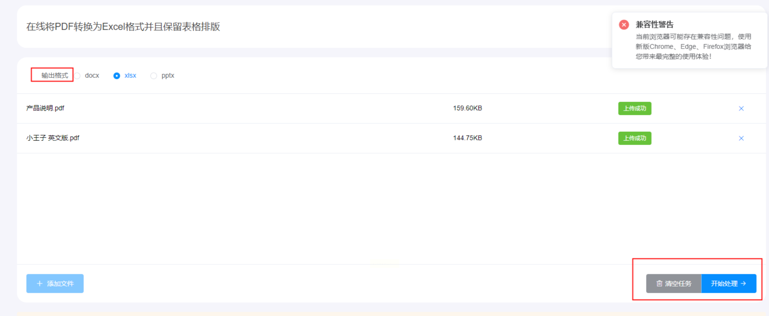 4. 选择输出格式:默认是Excel(XLSX),确认后点击“Convert PDF”。