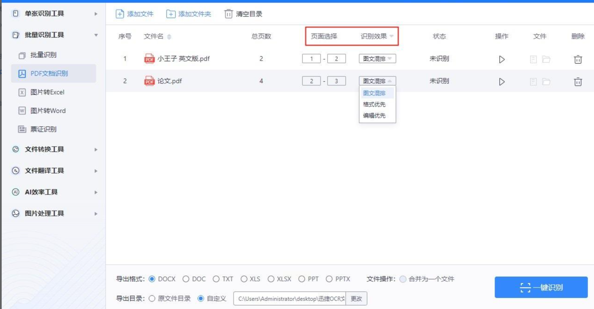 4. 设置识别参数:在右侧设置里,选择识别效果(有3种内置模式可选,建议选“表格识别增强”,对复杂表格更友好)。