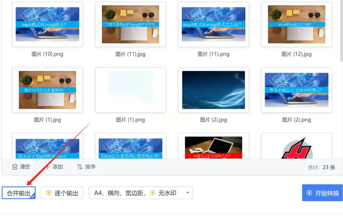 在弹出的转换窗口中,您可以看到所有图片的缩略图列表。在此界面中,选择“合并输出”或“合并为一个PDF文件”选项,以确保所有图片整合到同一文档中。您还可以在此调整图片顺序,或删除不需要的图片。