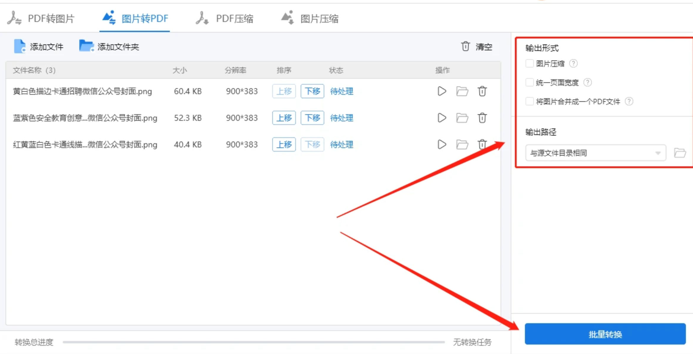 点击“添加文件”或直接拖拽图片至工作区,将需要转换的JPG、PNG等格式图片导入。在软件右侧的设置面板中,选择输出格式为PDF,并勾选“合并为一个文件”选项。您还可以根据需要设置输出质量、页面方向等参数。