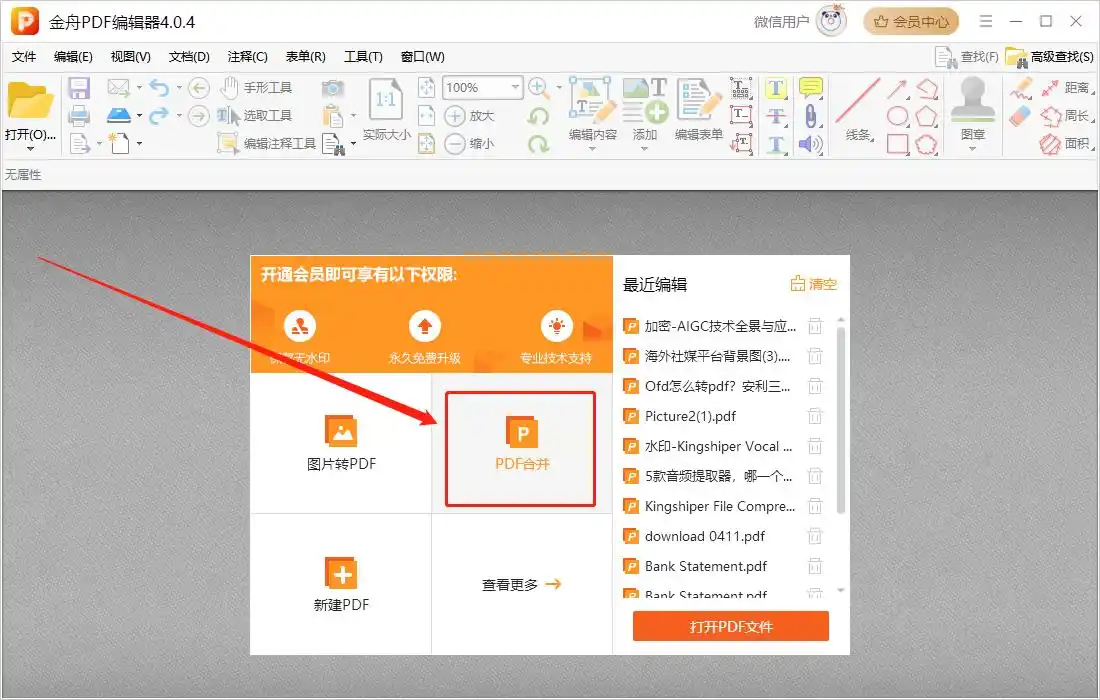 步骤一:在电脑上安装并启动金舟PDF编辑器。打开软件后,你会看到一个醒目的功能导航界面,直接点击其中的“PDF合并”选项进入操作区。