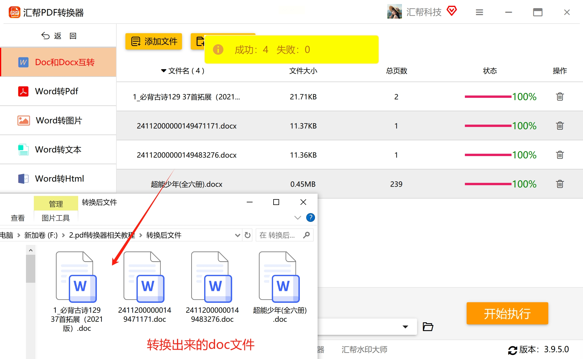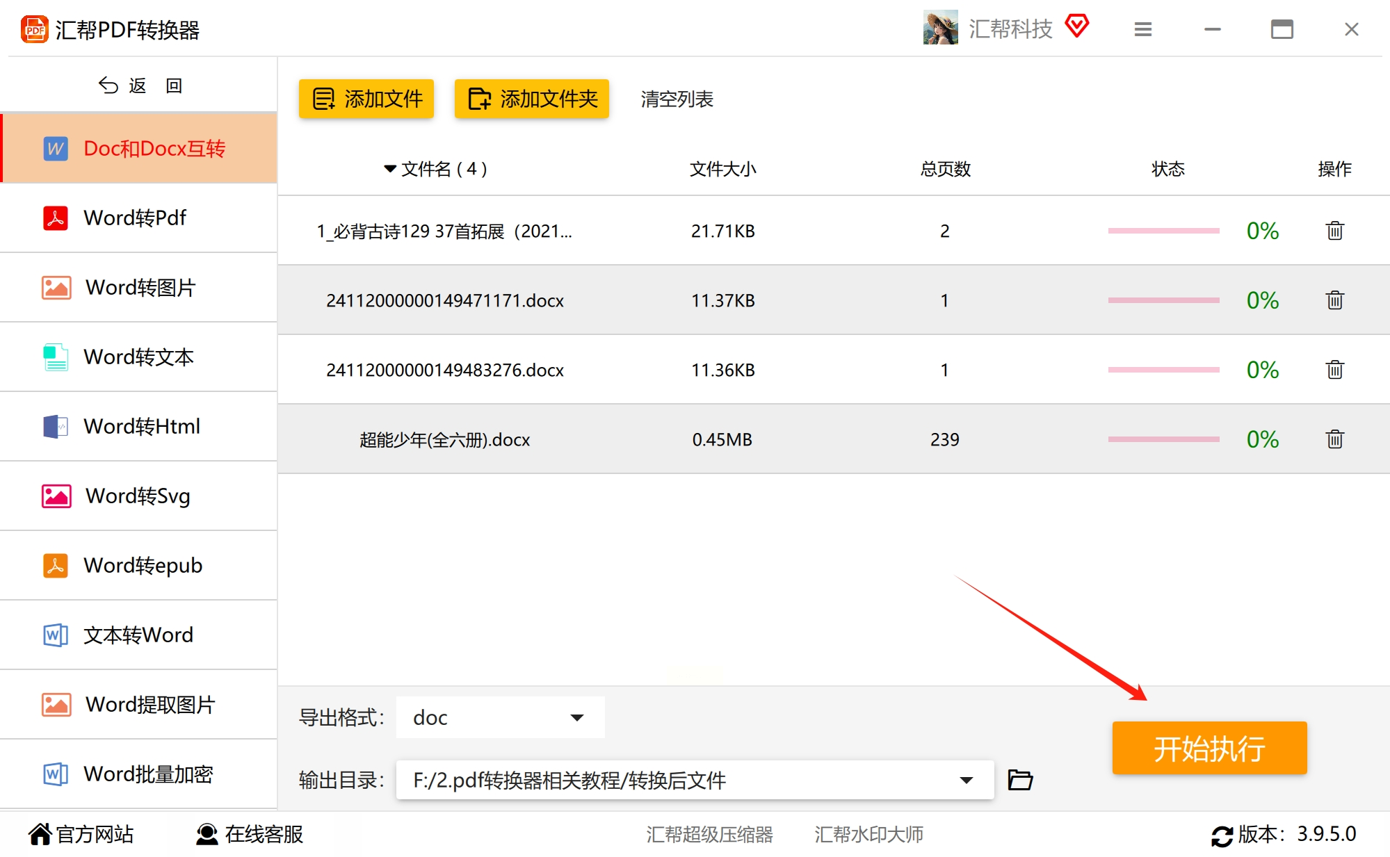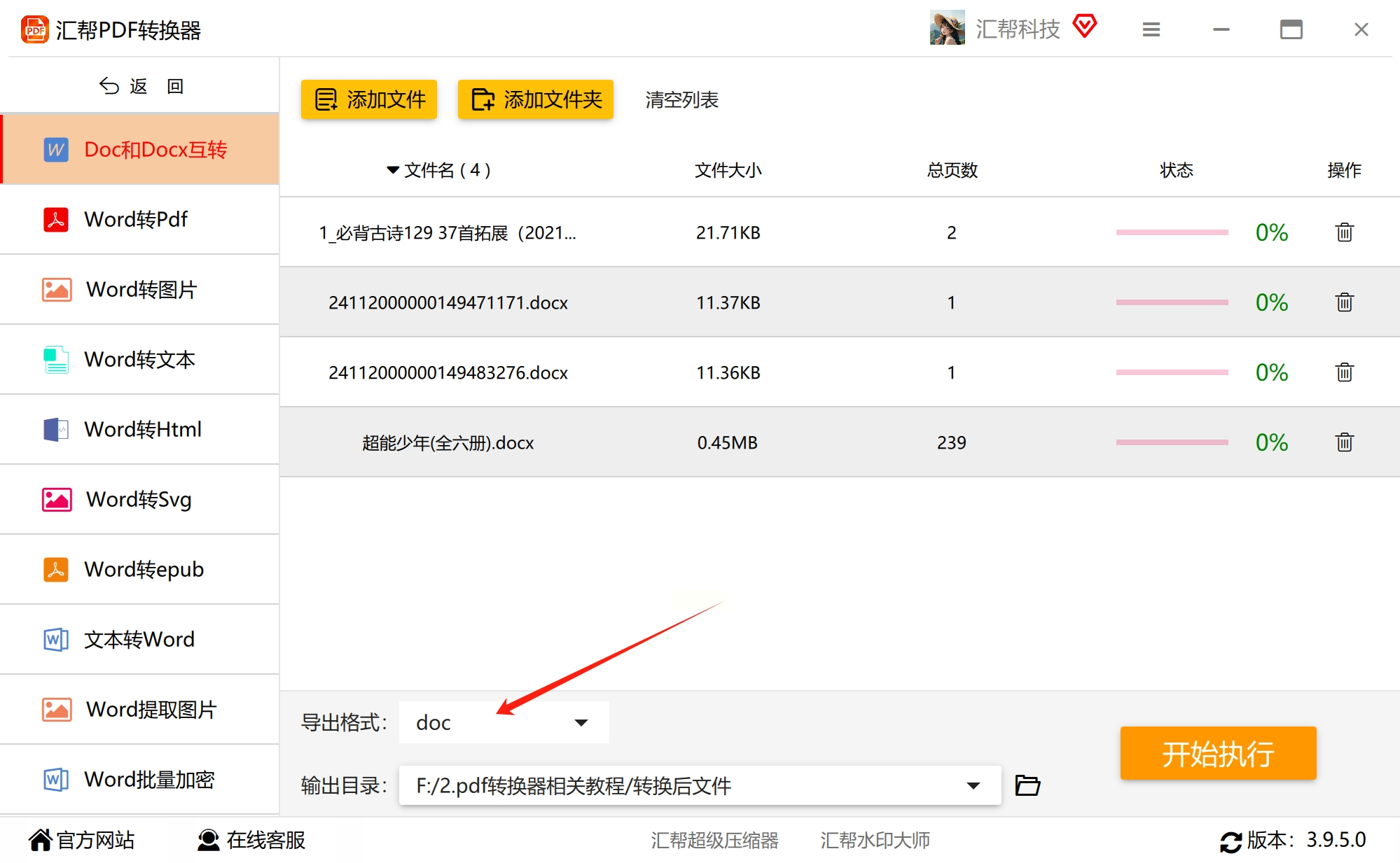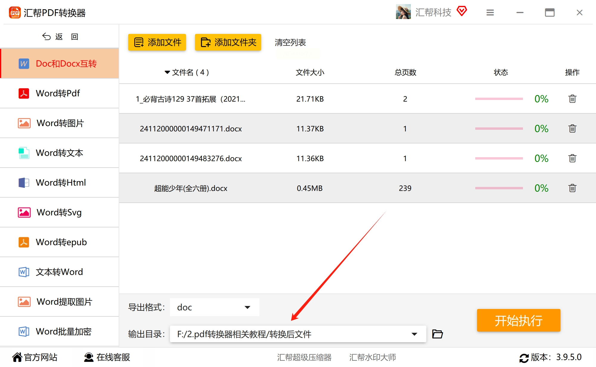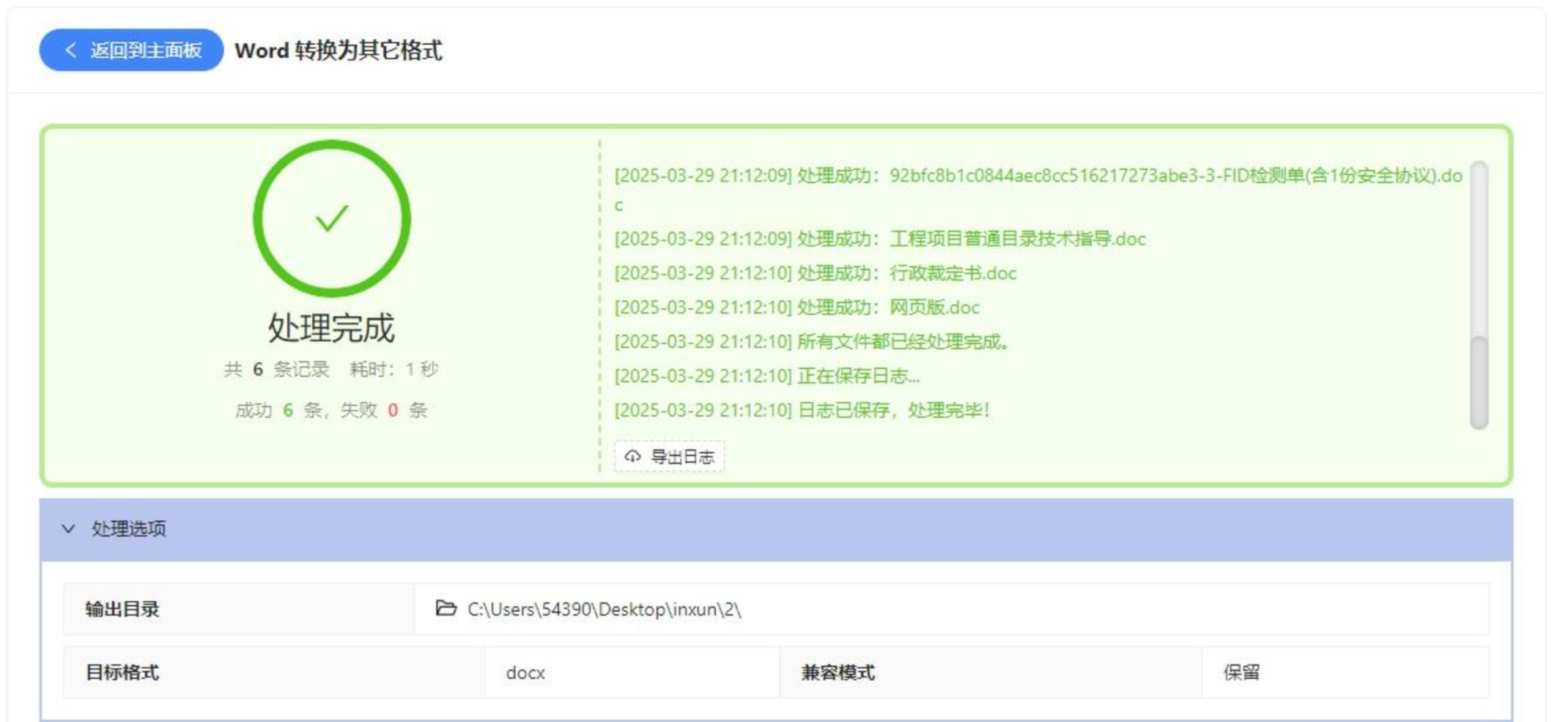 点击「开始执行」按钮,软件会自动处理转换。转换完成后,打开输出文件夹,你会看到新生成的doc文件,文件名和原文件类似(比如原文件是“报告.docx”,转换后是“报告.doc”)。
