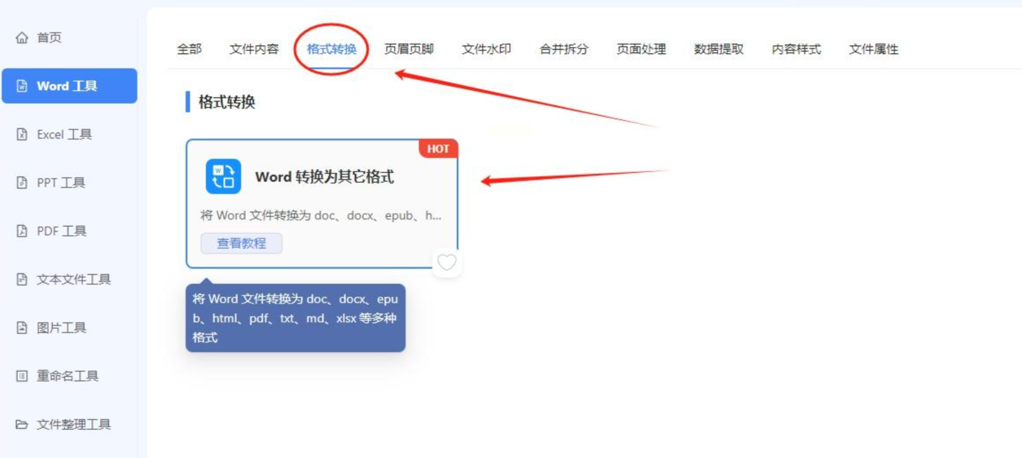 双击桌面上的「快迅批量处理工具箱」图标,打开后在左侧菜单栏找到「Word工具」,然后在右侧分类里选「Word 转换为其它格式」。这个分类下除了转doc,还能转成PDF、TXT等格式,很实用。
