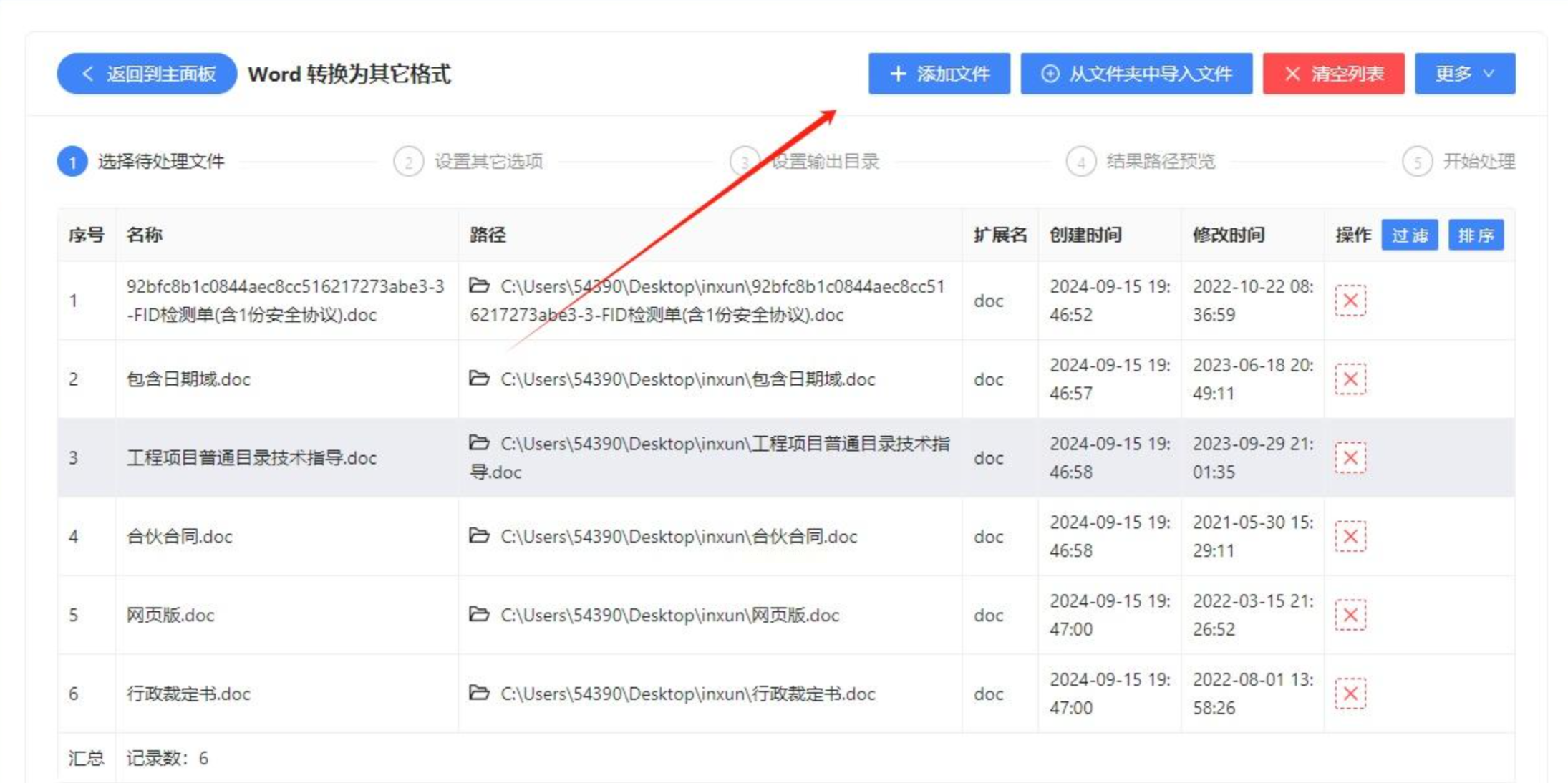 点击「添加文件」按钮,找到存放docx的文件夹,选中文件后点击打开。如果是批量转换,同样可以按住Ctrl多选,或者直接拖选整个文件夹里的文件。