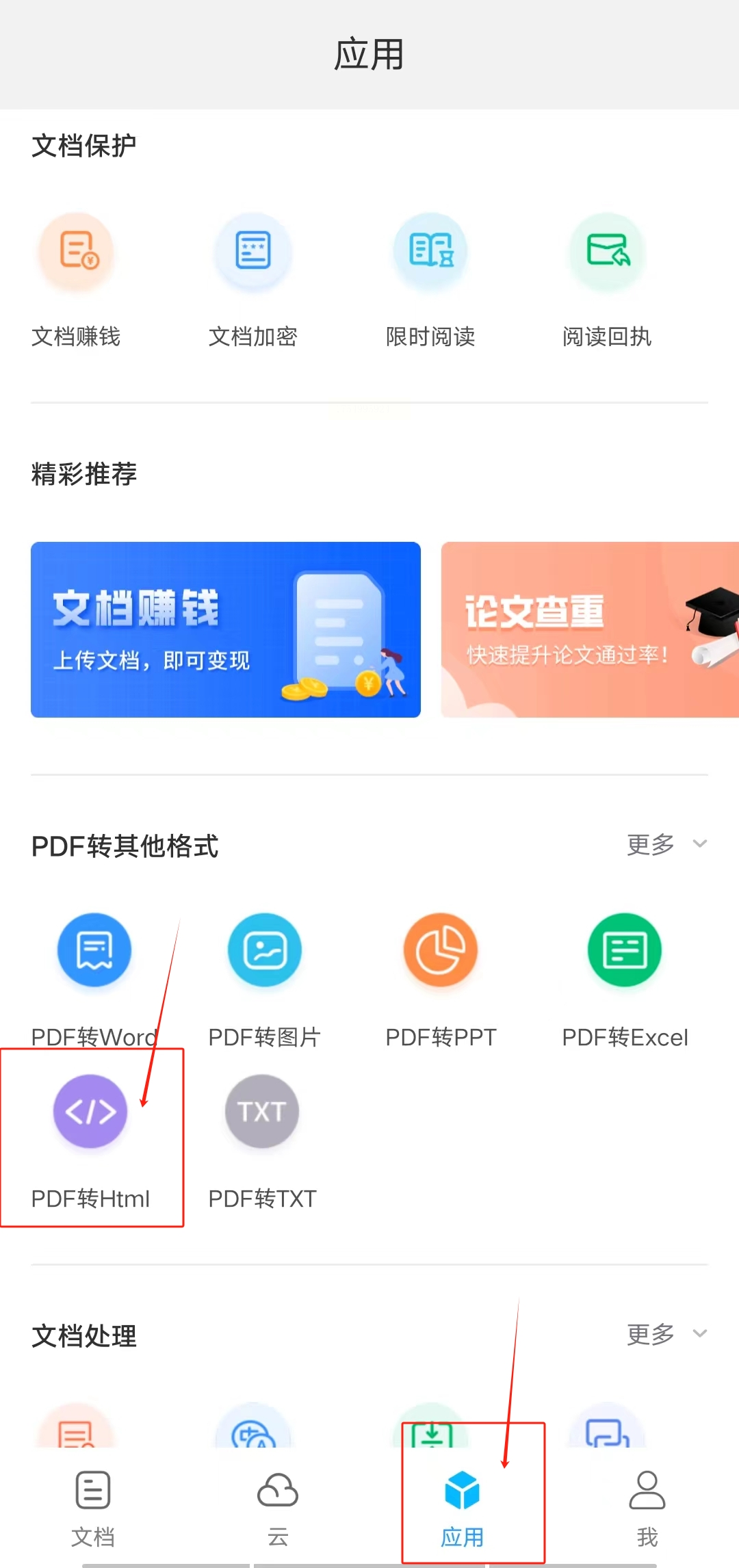 2. 选择转换功能: 点击底部的“应用”选项,找到“PDF转其他格式”下的“PDF转Html”。