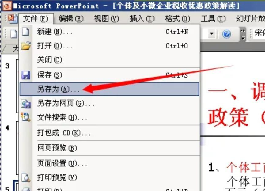 在PPT界面左上角,找到“文件”选项,点一下,弹出的菜单里有“另存为”这一项,点它!